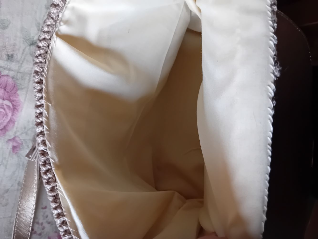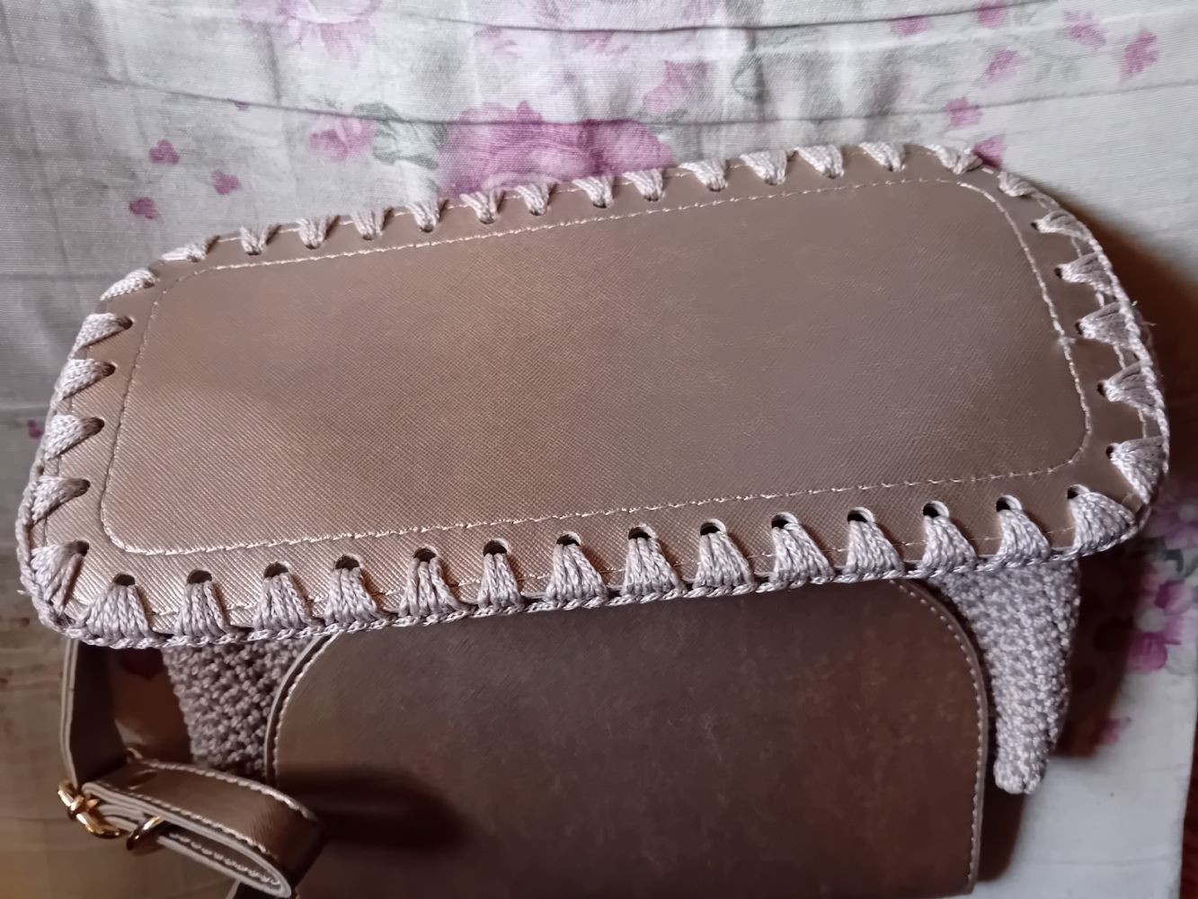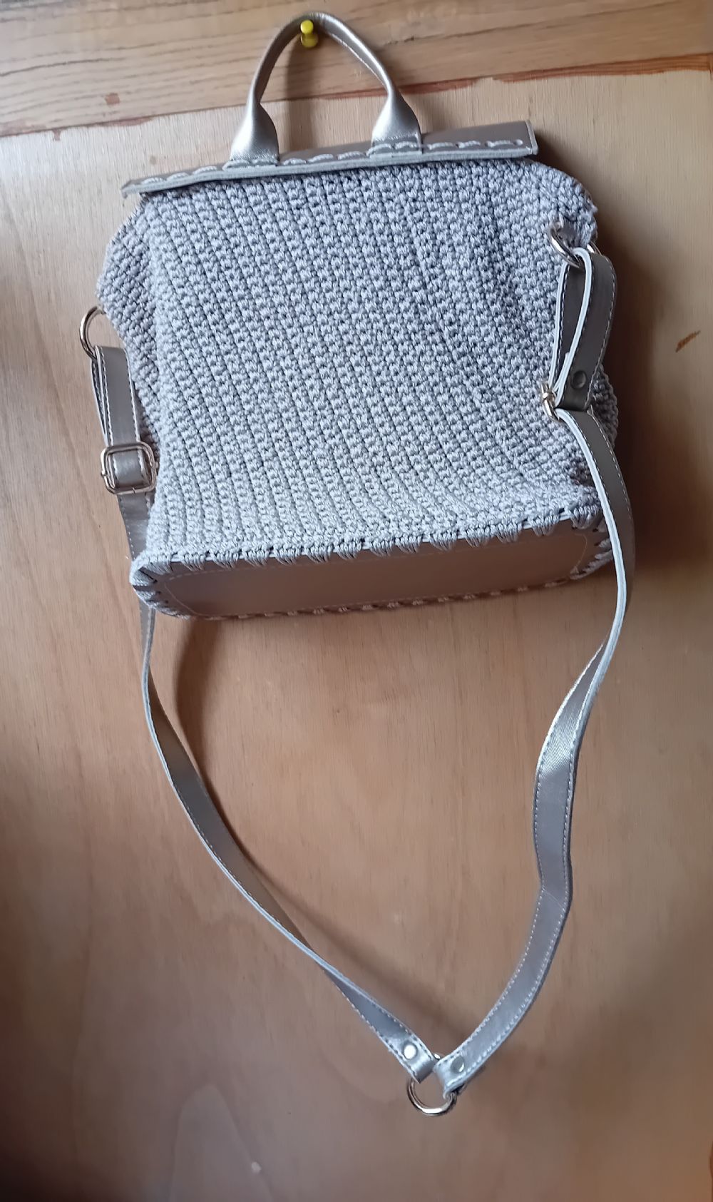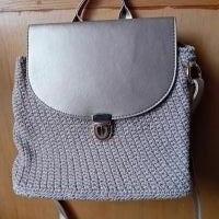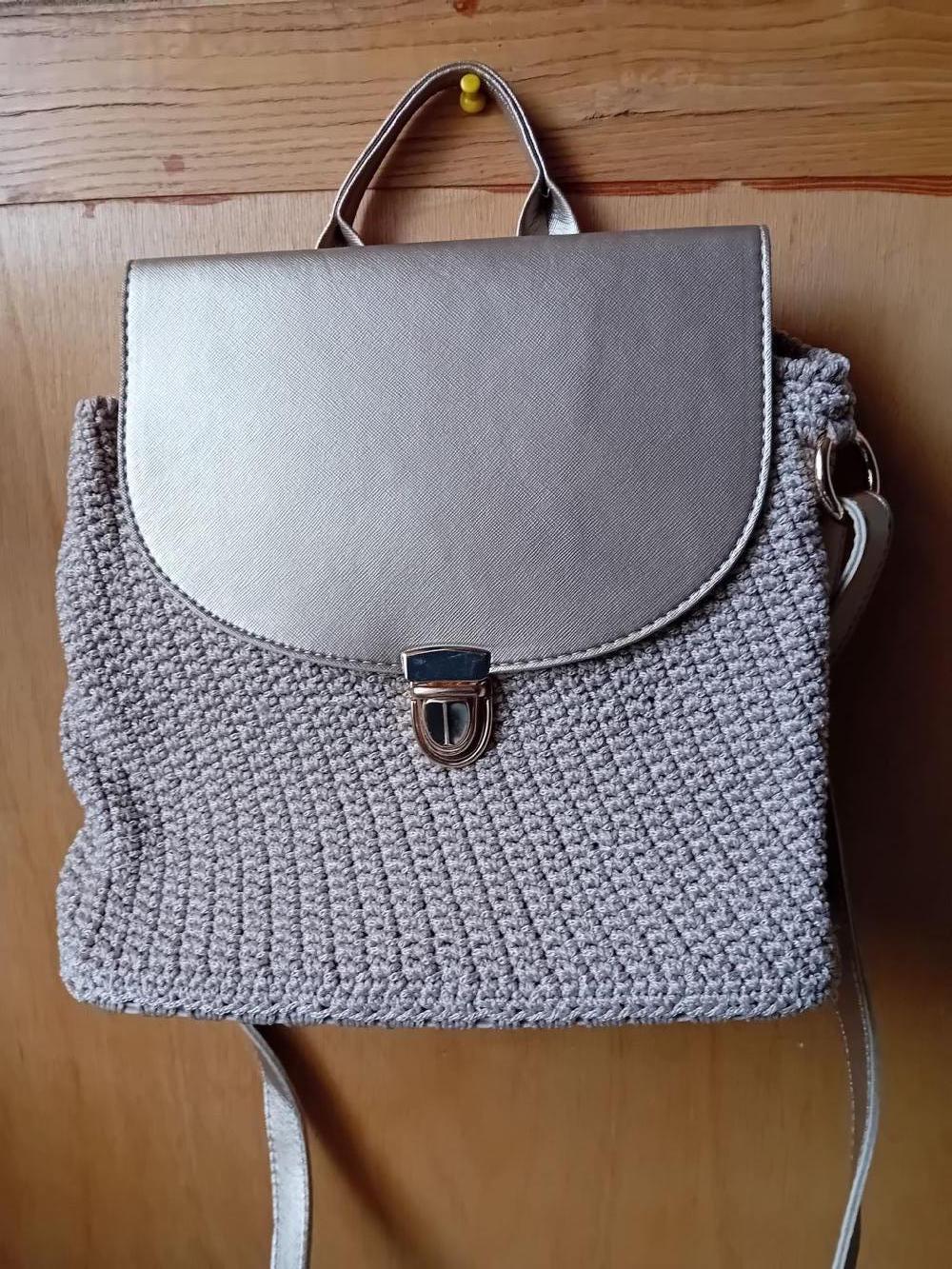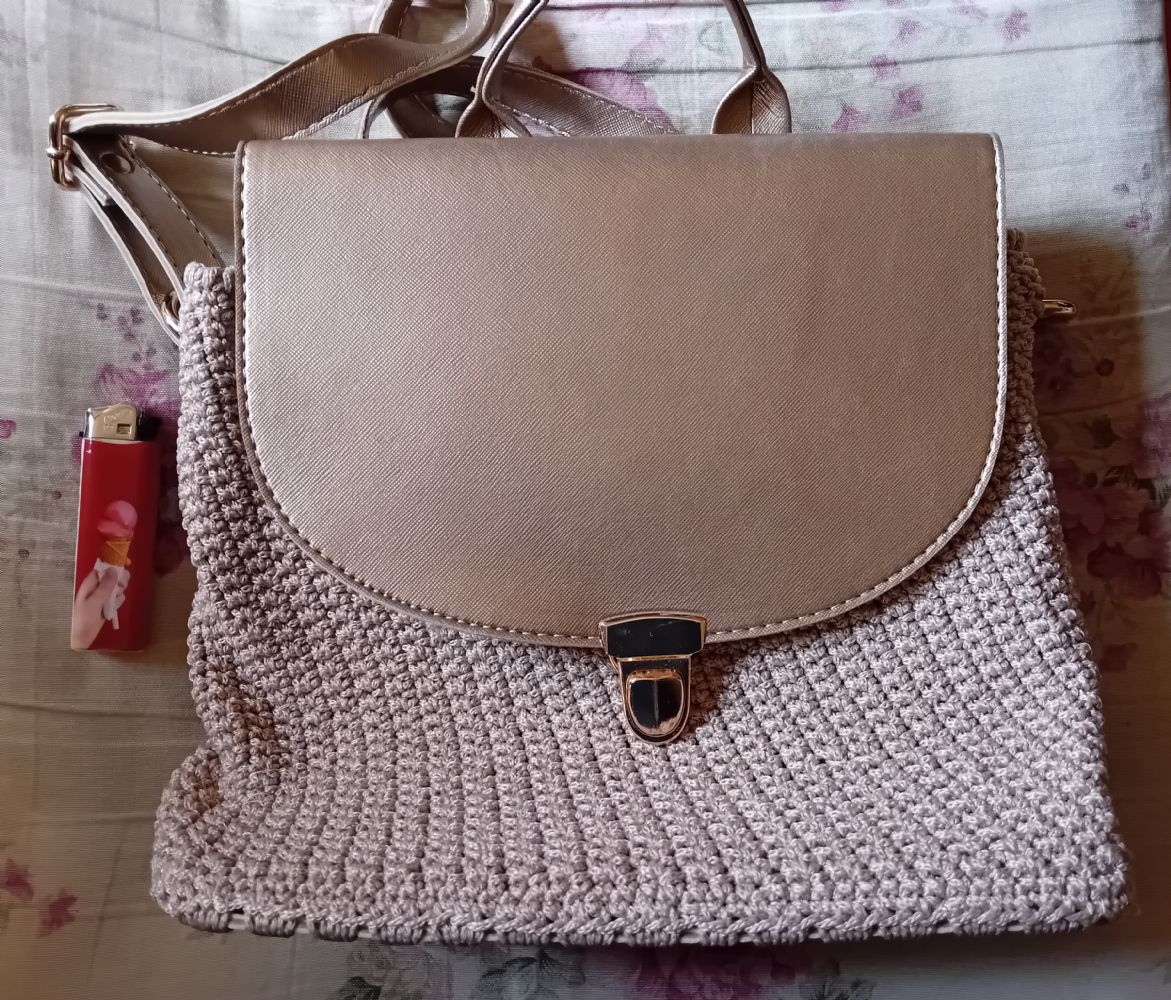 Descrizione:Borsa a spalla o a tracolla, appena fatta a mano dalla mia amica, con filato beige o color corda (sicuramente buono e sicuramente nuovo, altro non usa mai) ed ecopelle color oro chiaro / platino (che invece credo la declassi parecchio), foderata ma senza taschine, metalli color oro. Se volete, e se non avete fretta, posso chiederle di cucirci la sua etichettina/loghino.