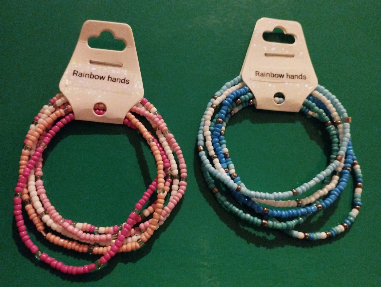 Descrizione:2 set bracciali perline, rosa-bianco e azzurro-bianco