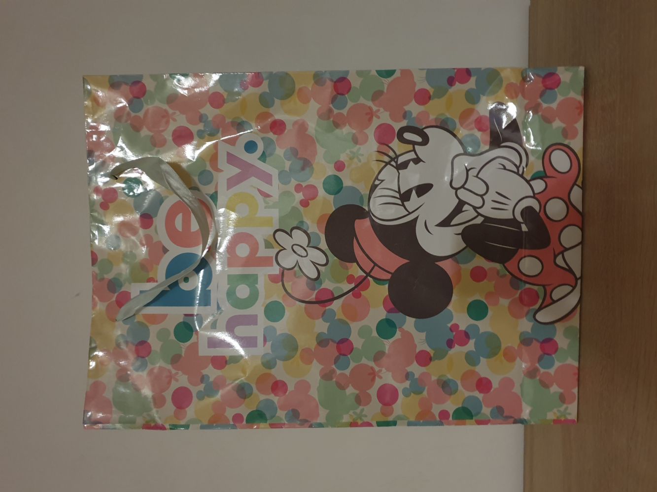Descrizione:Grande busta regalo in carta plastificata con manici in raso, usata una volta