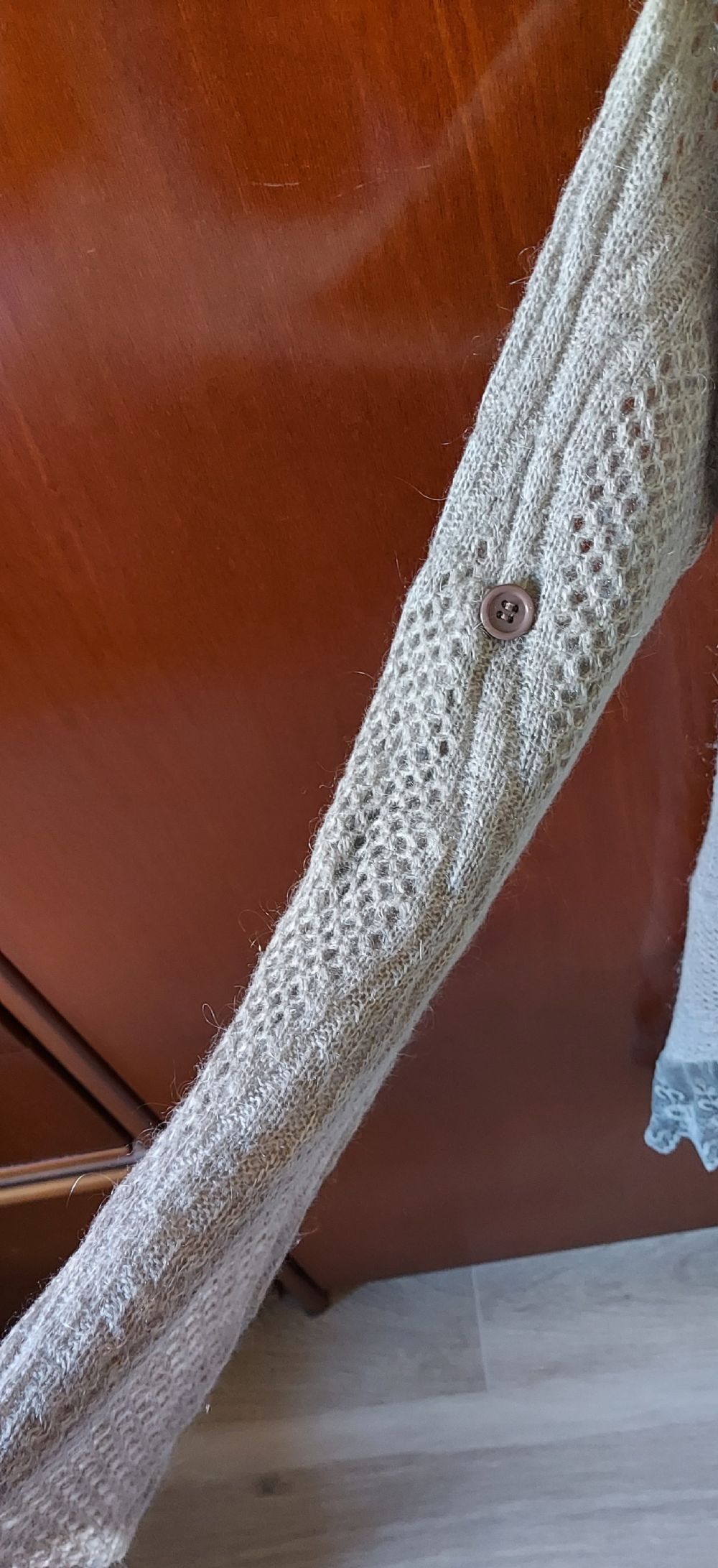 A un bottone sulle maniche per accorciare nel caso si volesse, e un bottone per tenerlo ho come nella 1 foto o nella 2 foto.