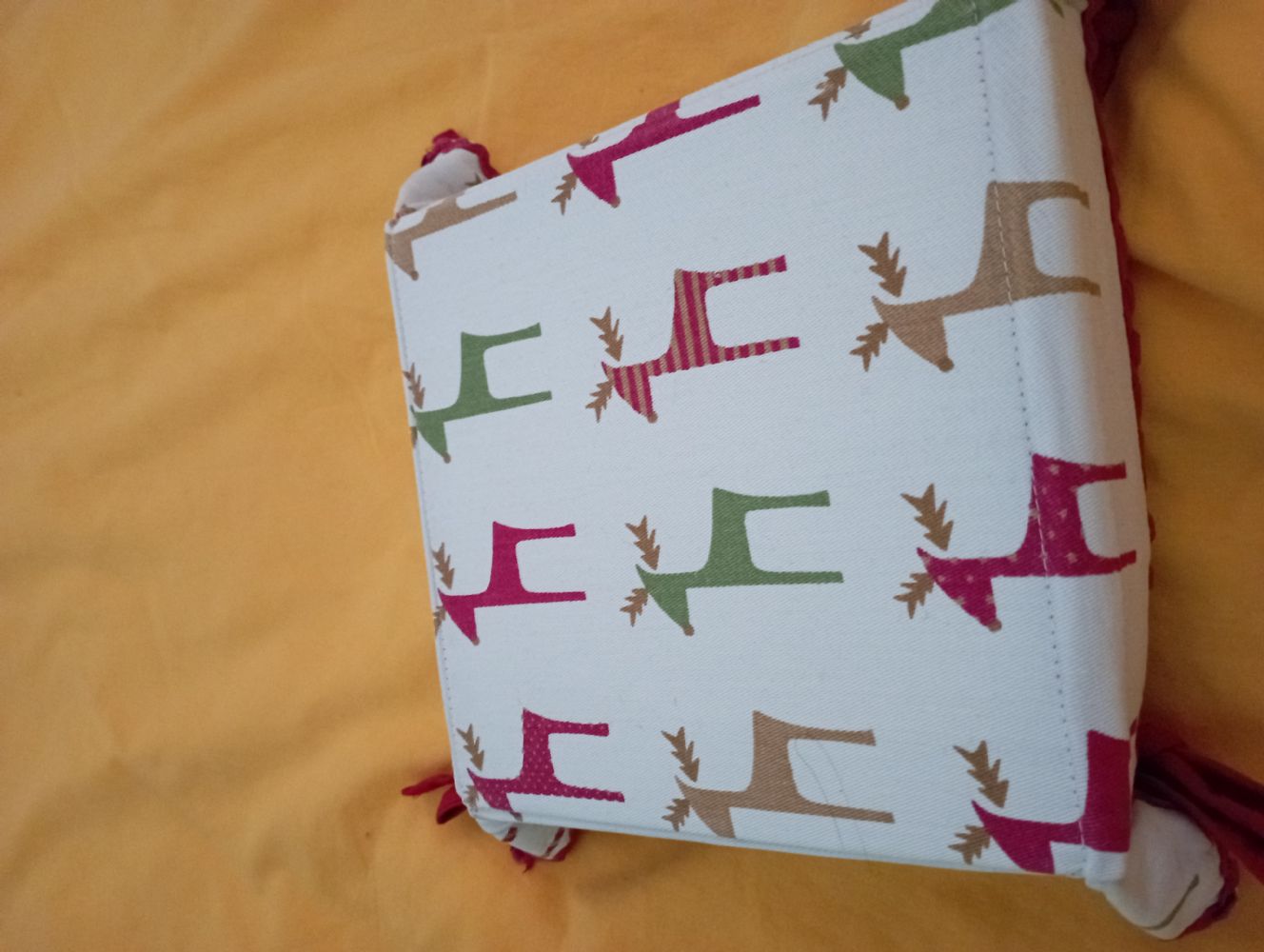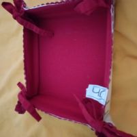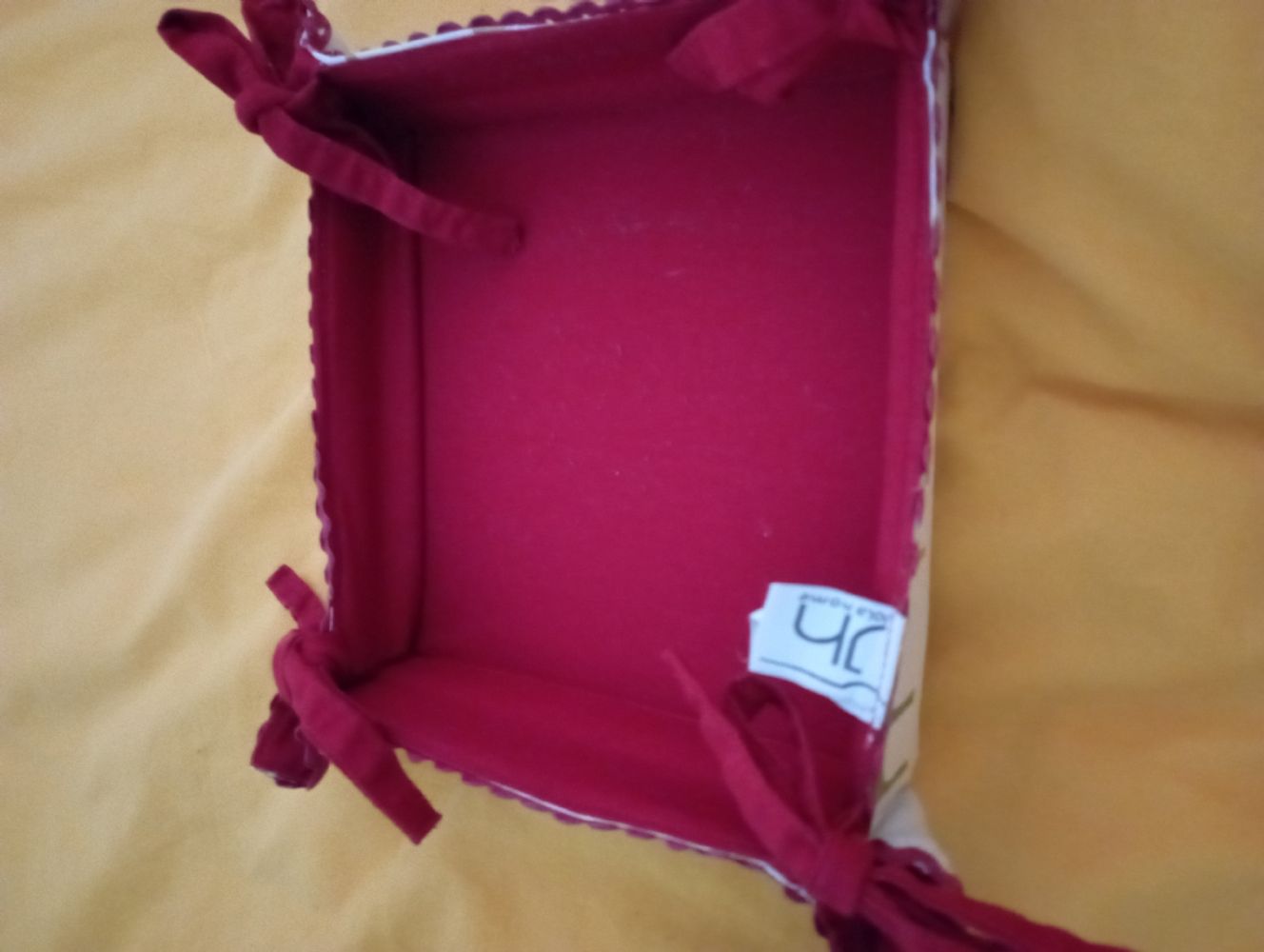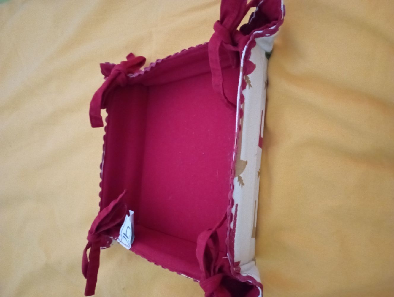 Descrizione:Cestino porta pane quadrato, credo sia materiale plastico rivestito da tessuto, non sfoderabile. Praticamente nuovo.
