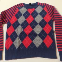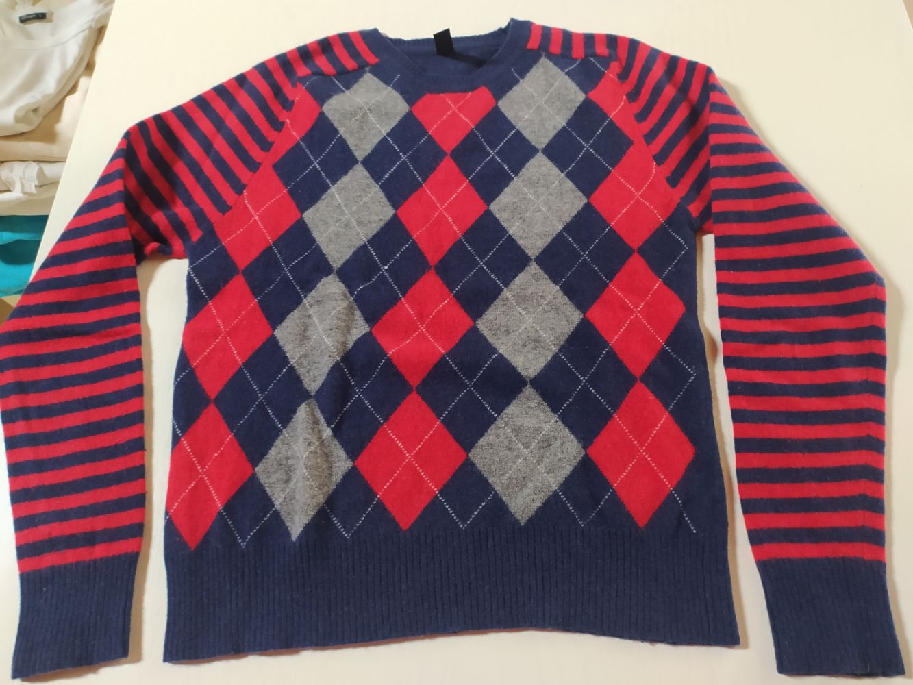 Maglione tg S a rombi 80% lana, 20% poliammide, ascelle cm 44, lunghezza cm 56.