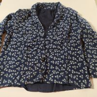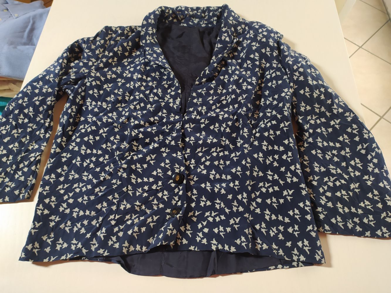 Giacca blu e bianca foderata, non conosco il materiale, è estiva o mezza stagione, spalle cm 48, ascelle cm 60, lunghezza cm 61.