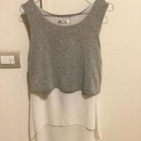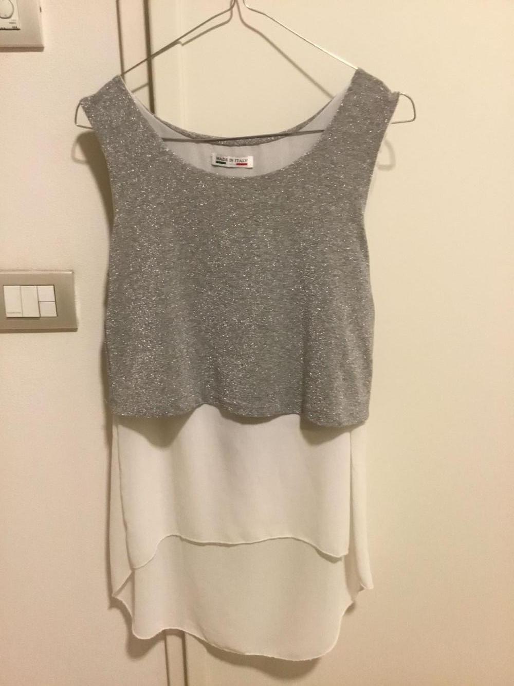 Descrizione:Canotta estiva panna, più lunga dietro, con doppiatura più corta nella parte superiore in argento lurex.
