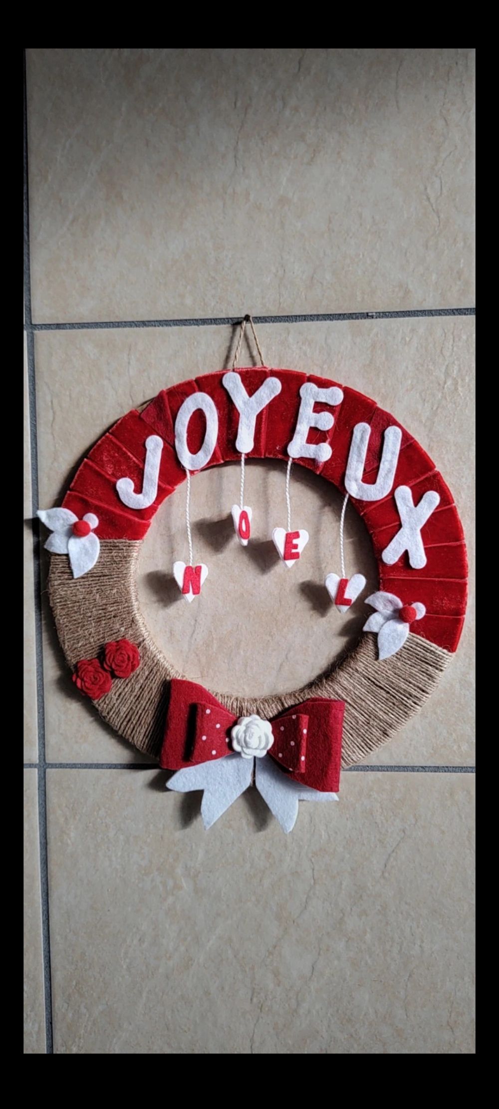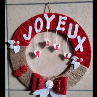 Descrizione:Ghirlanda con base in legno rivestita di corda e velluto con applicazioni in feltro.