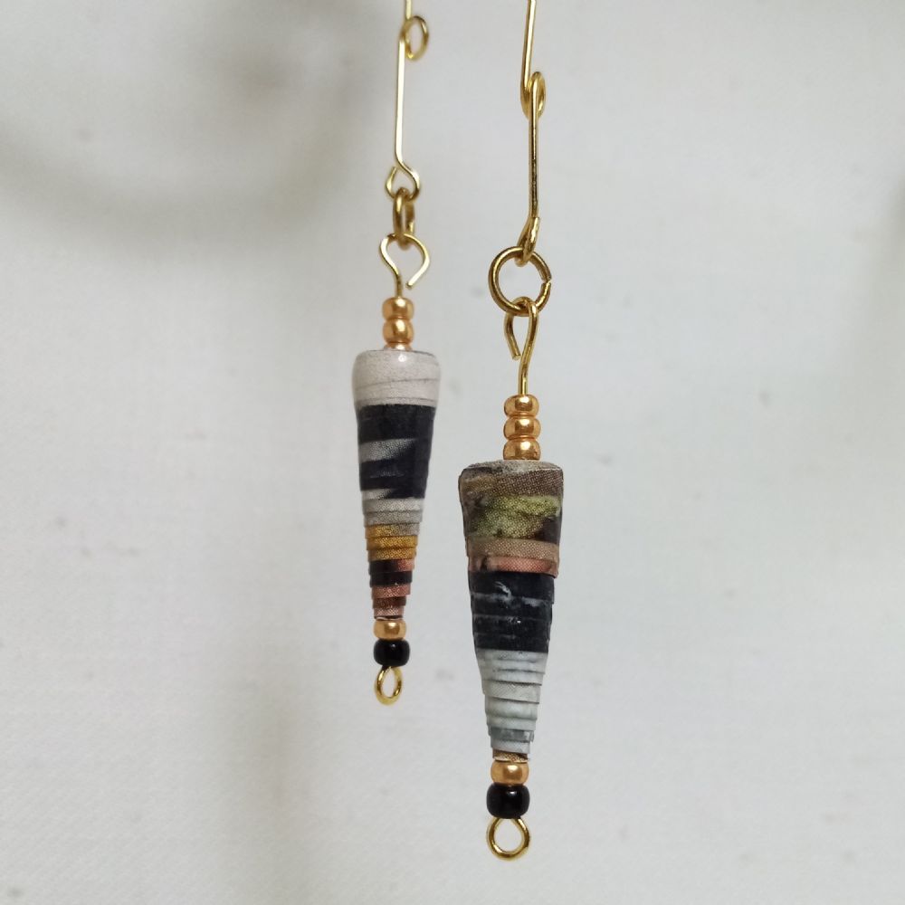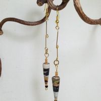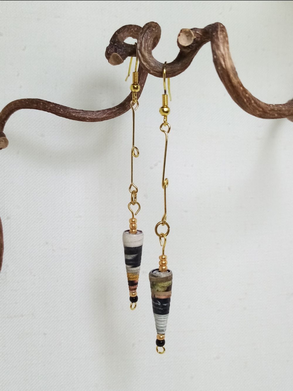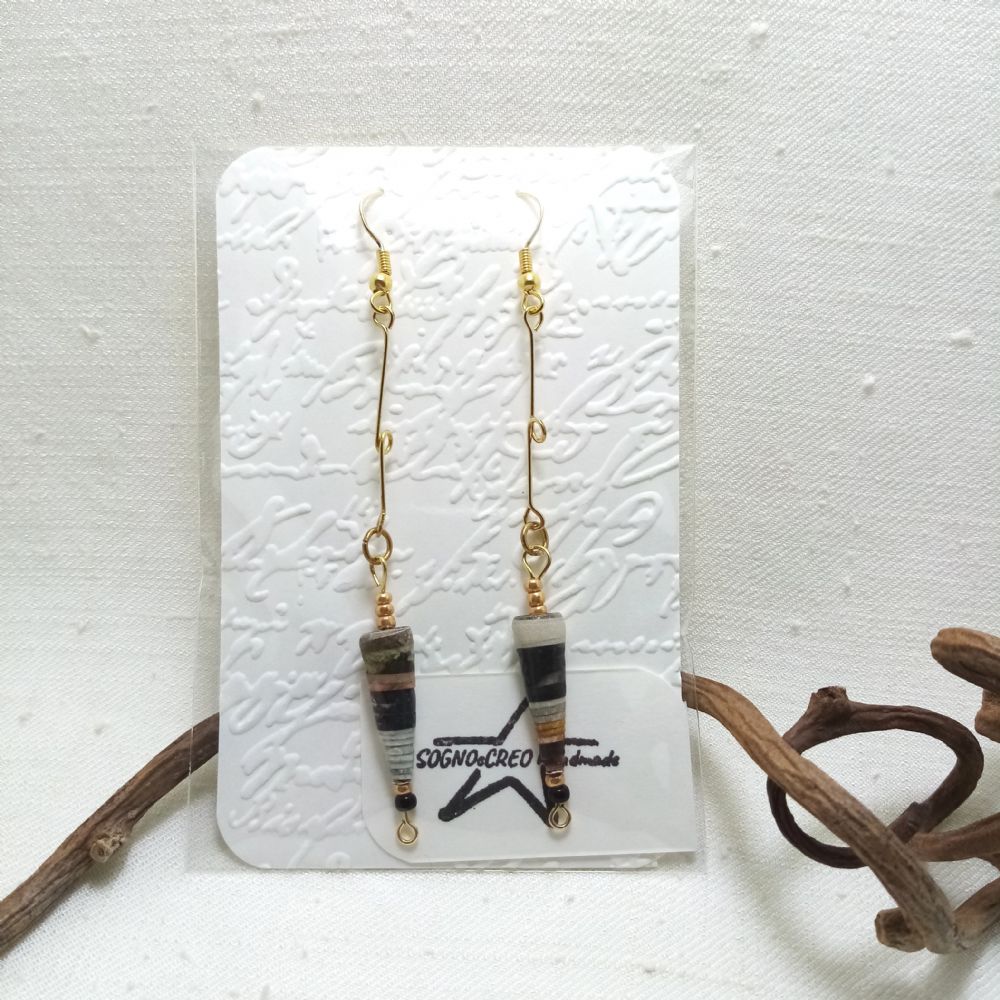 Descrizione:Orecchini auto prodotti con perle di carta coniche sfumature bianco-beige-nero, smaltate, fatte a mano. Lunghezza circa 7 cm. Monachella dorata nickel free.