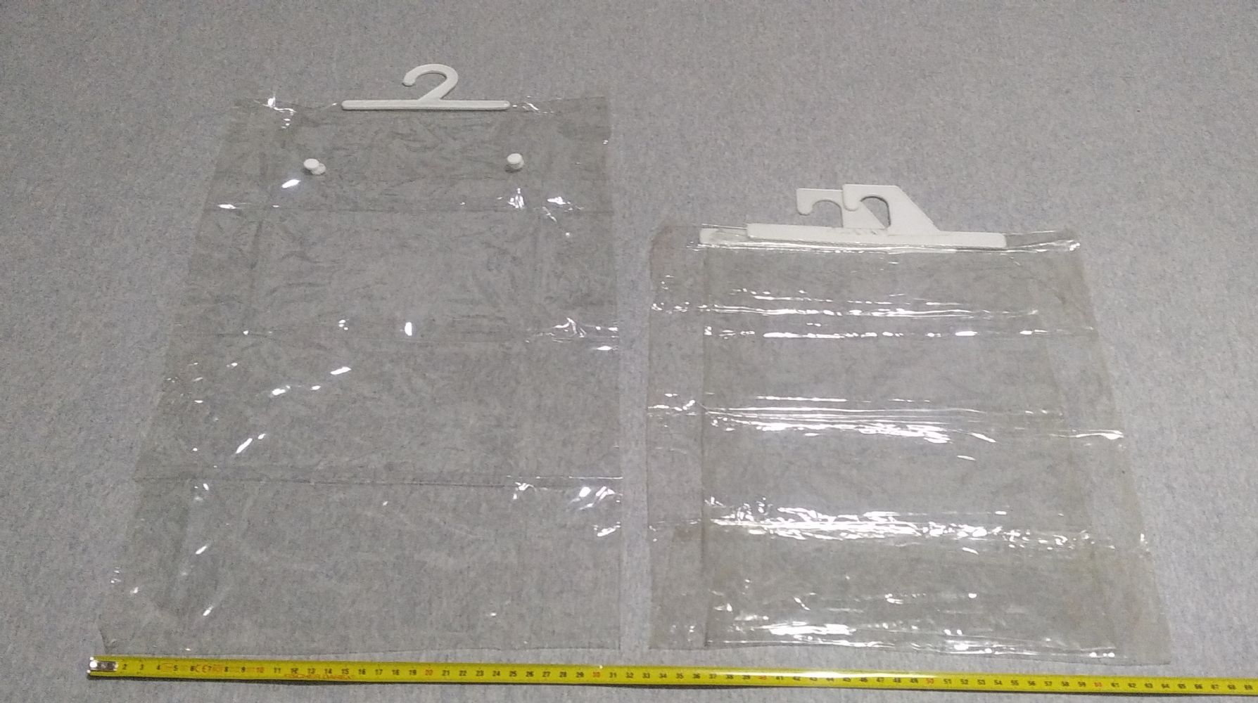 Descrizione:Buste da appendere in plastica resistente, 1 grande con automatici e 2 più piccole, ex confezioni intimo/costumi, comode per riporre qualsiasi cosa, hanno una pattina che chiude con biadesivo. Preferibilmente tutte insieme.