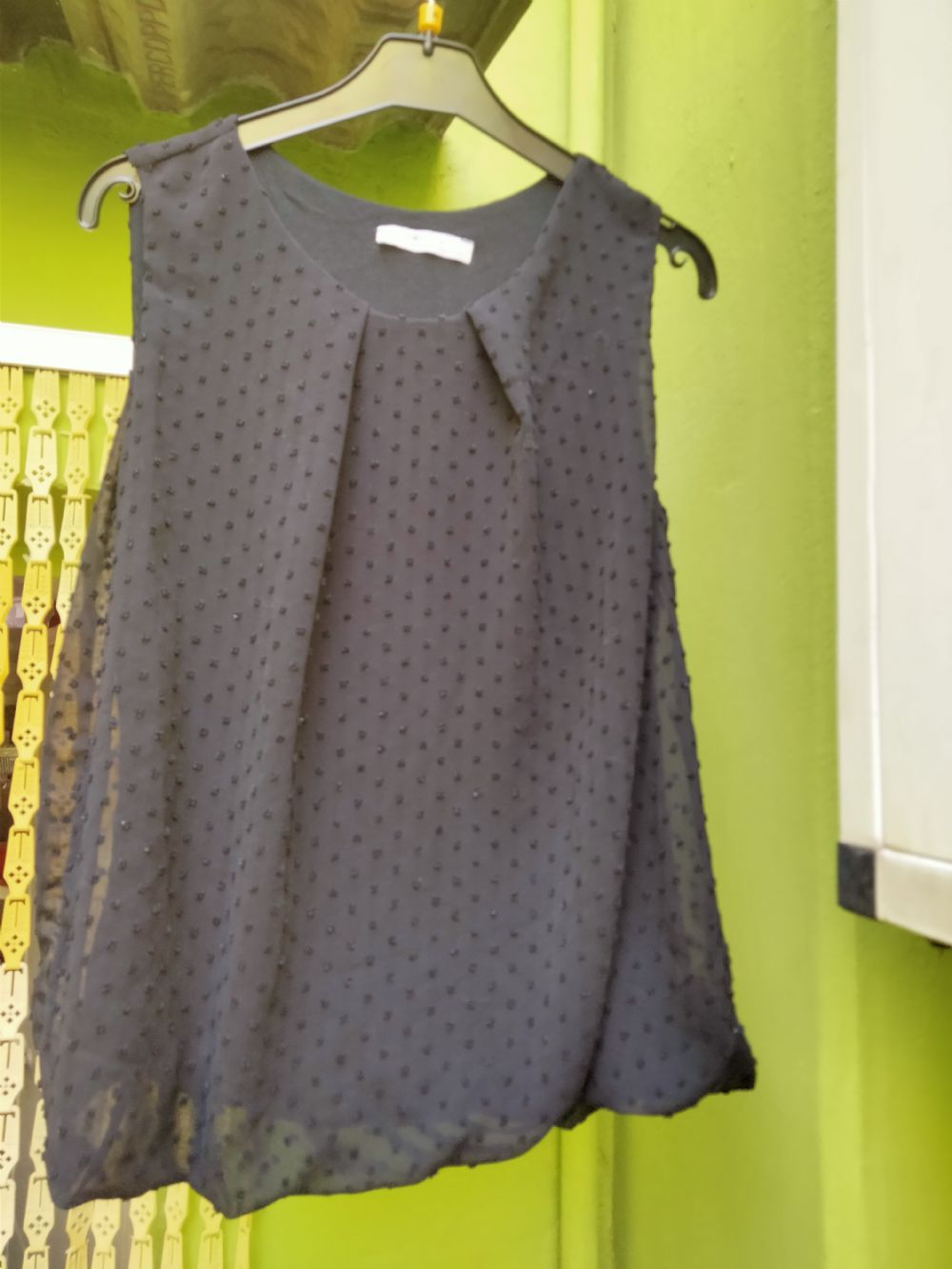 Top smanicato di colore nero, (dovrebbe essere una M) mancante di etichetta per stabilire misura e tessuto. Da ascella/ascella cm.48. Firmato Piazza Italia.