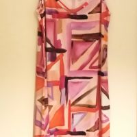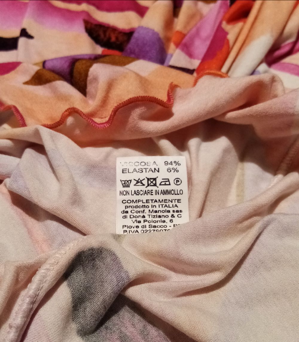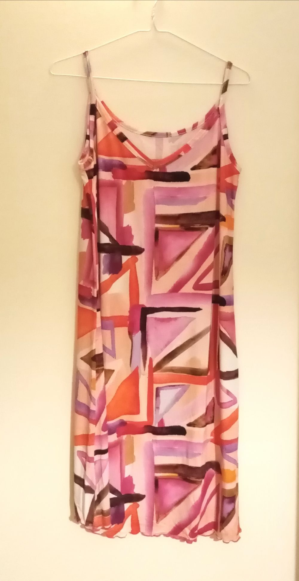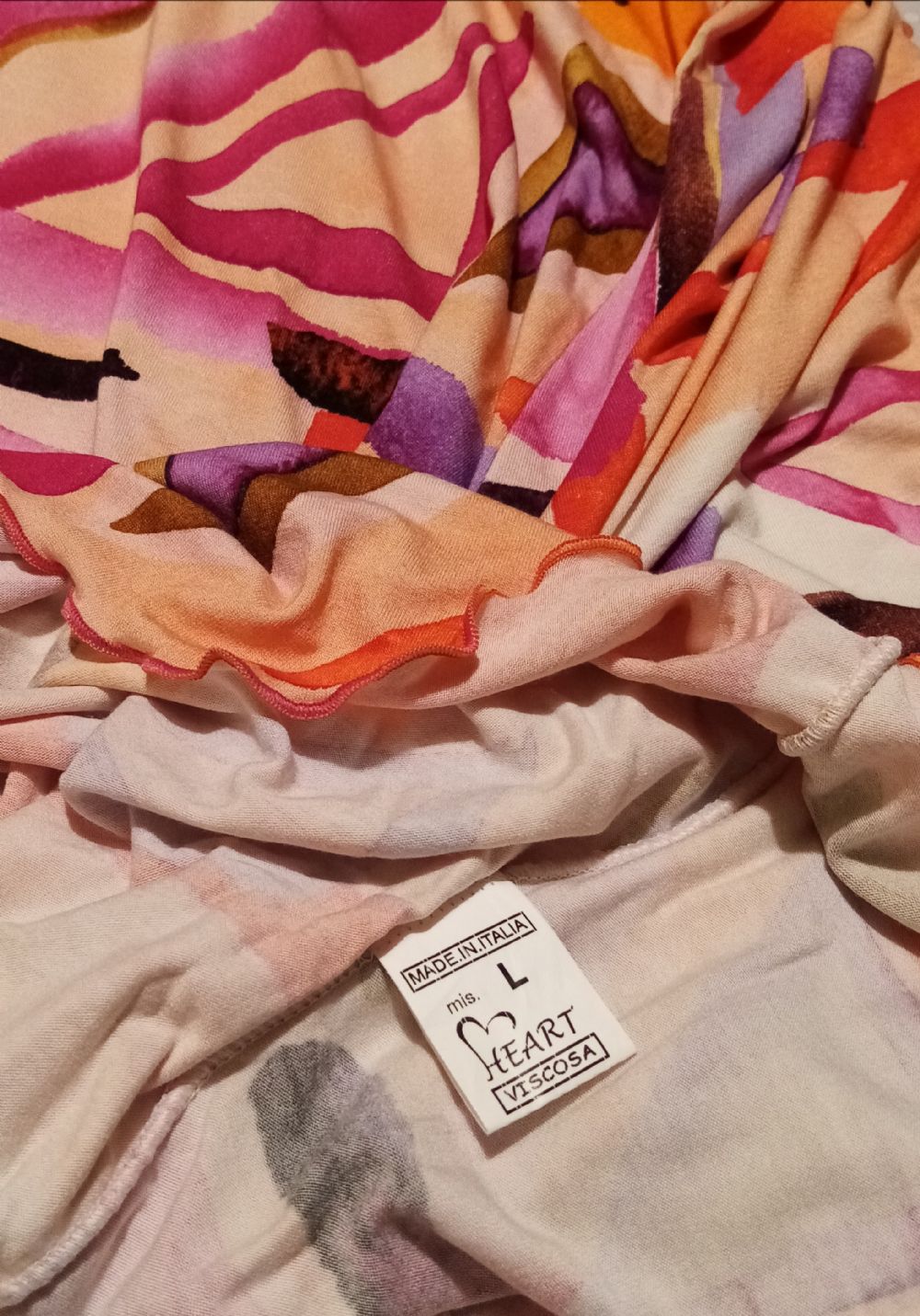 Vestito estivo in fantasia, in viscosa. Taglia riportata L ma veste un po'' meno. Lunghezza da scollatura 78 cm.