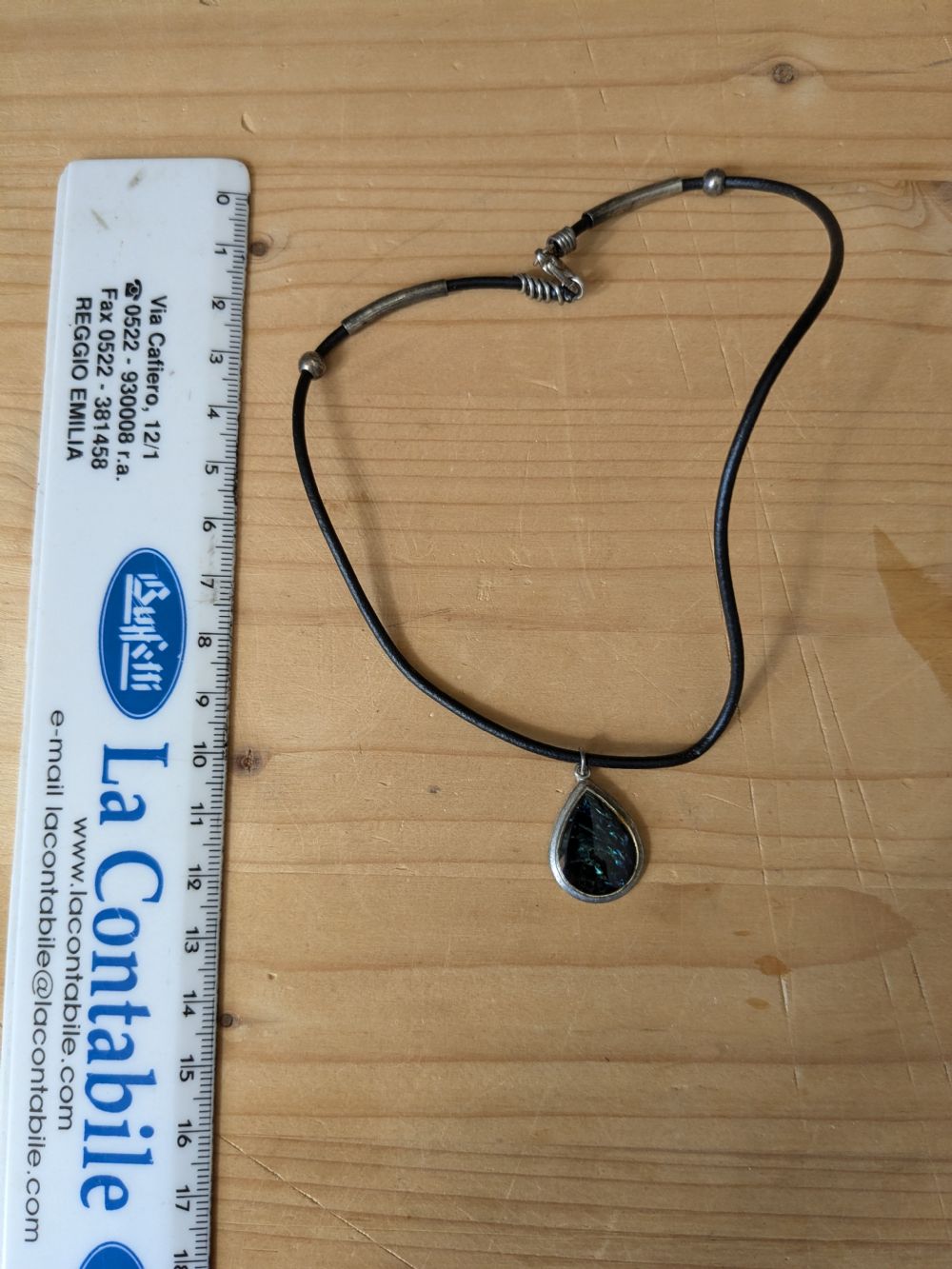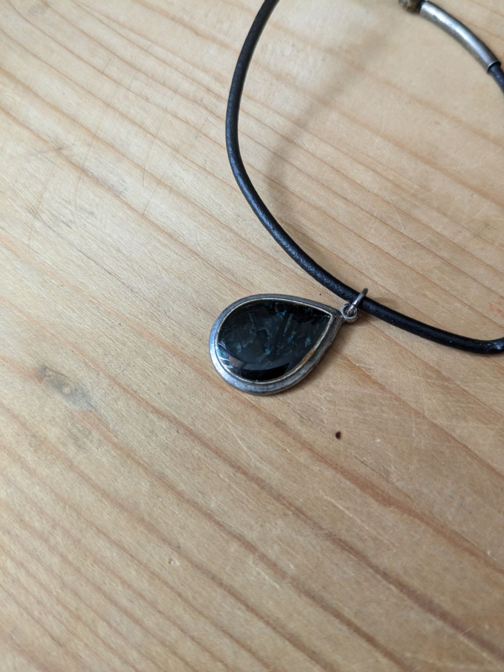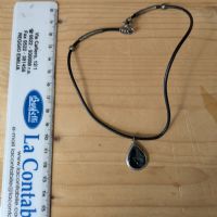 Descrizione:Collana con pendaglio a forma di goccia in metallo e pietra nera (non so cosa sia)