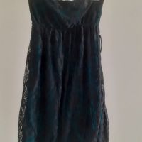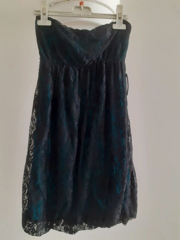 Descrizione:vestitino sotto in cotone color petrolio sopra pizzo nero, taglia unica ma elastico adatto da una XS/S forse anche m