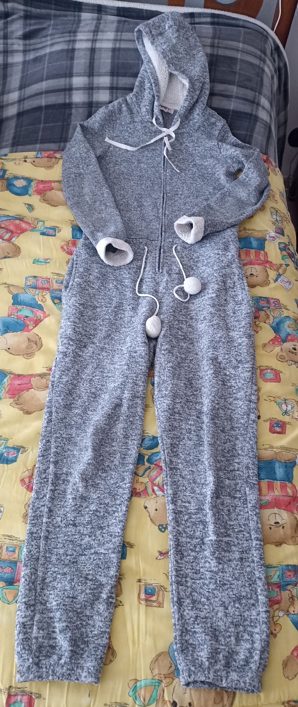 Descrizione:Tura intera in felpa calda e cappuccio in pecorella con coulisse, credo da casa. Coulisse con pon pon, zip davanti, tasche laterali.