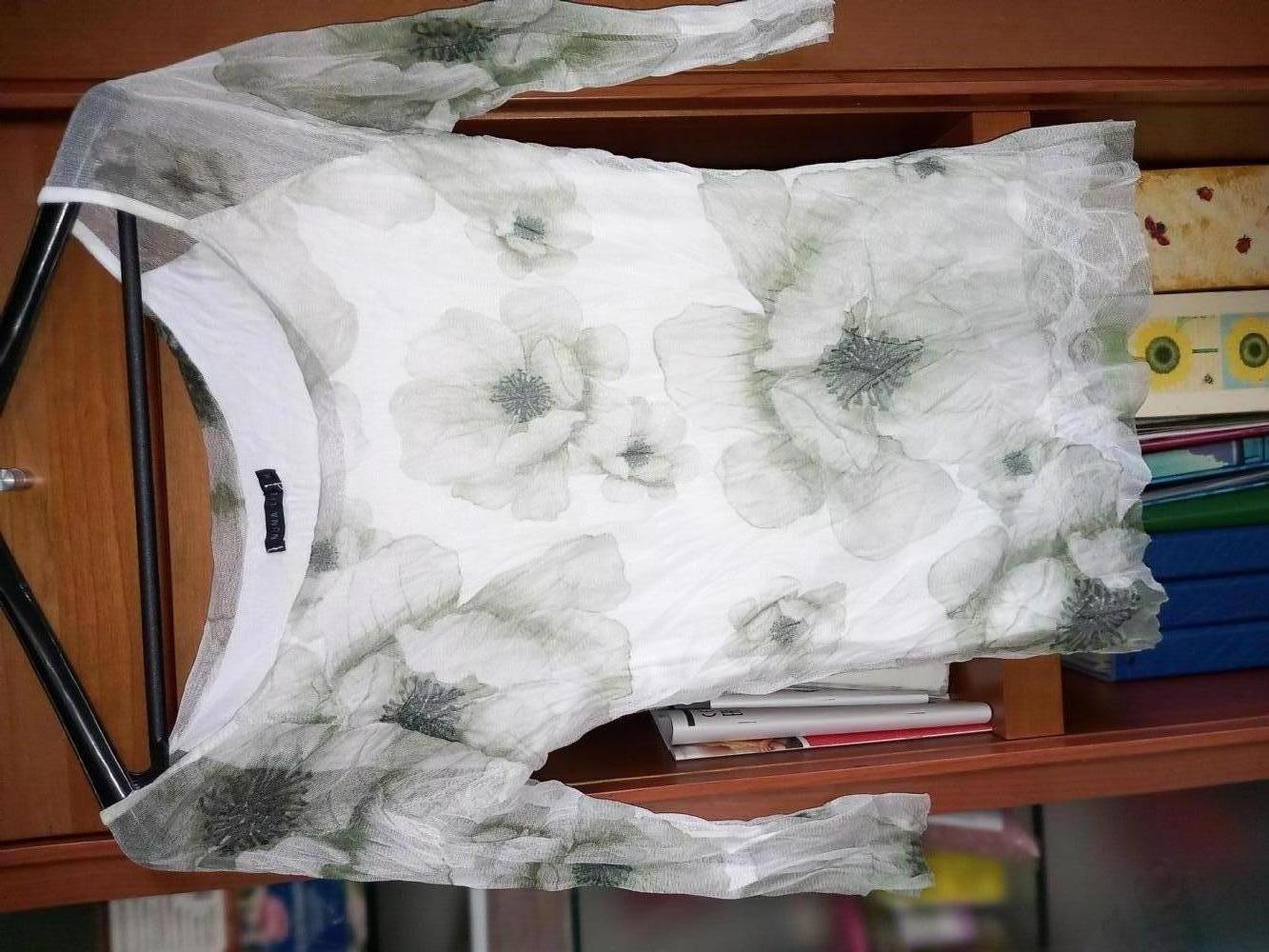 Maniche trasparenti, non conosco la composizione ma credo viscosa e poliestere. Perfetto da indossare con pantaloni o gonna bianchi. Taglia M