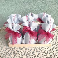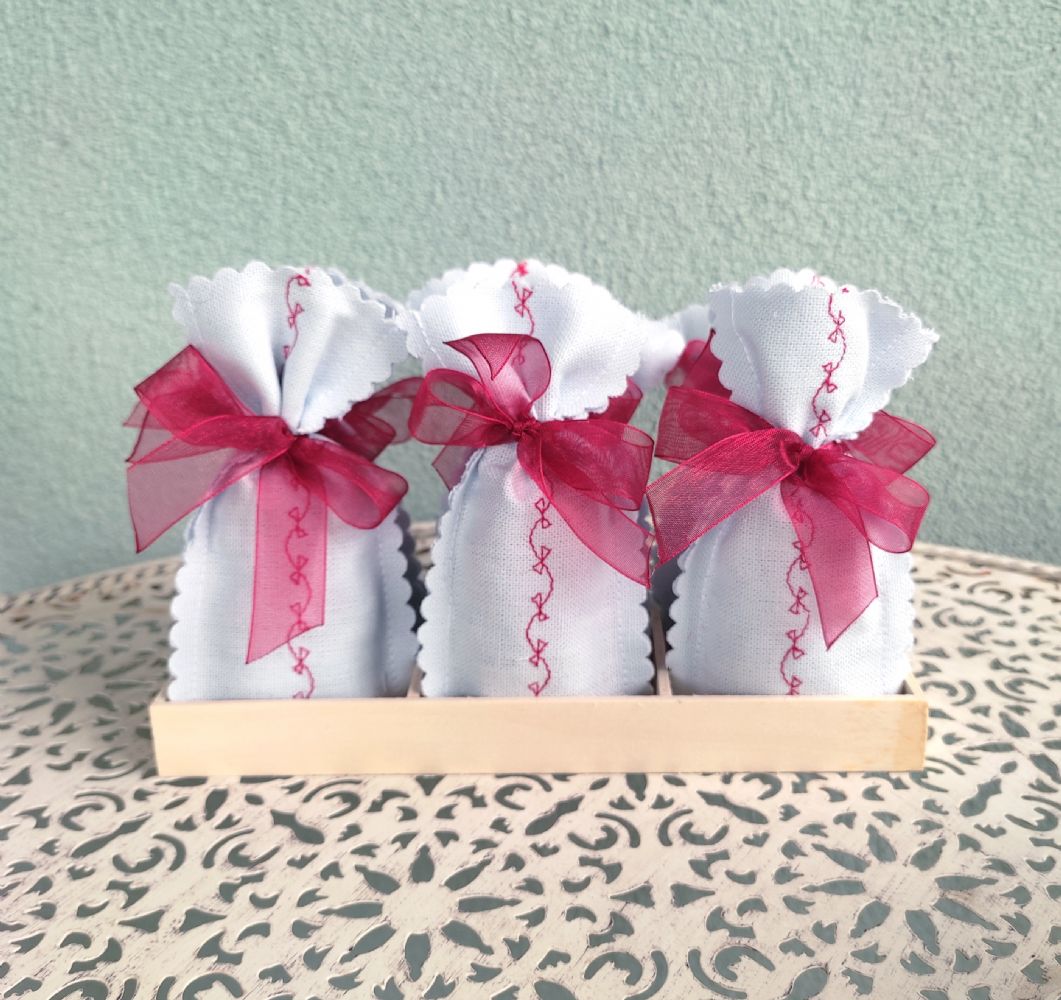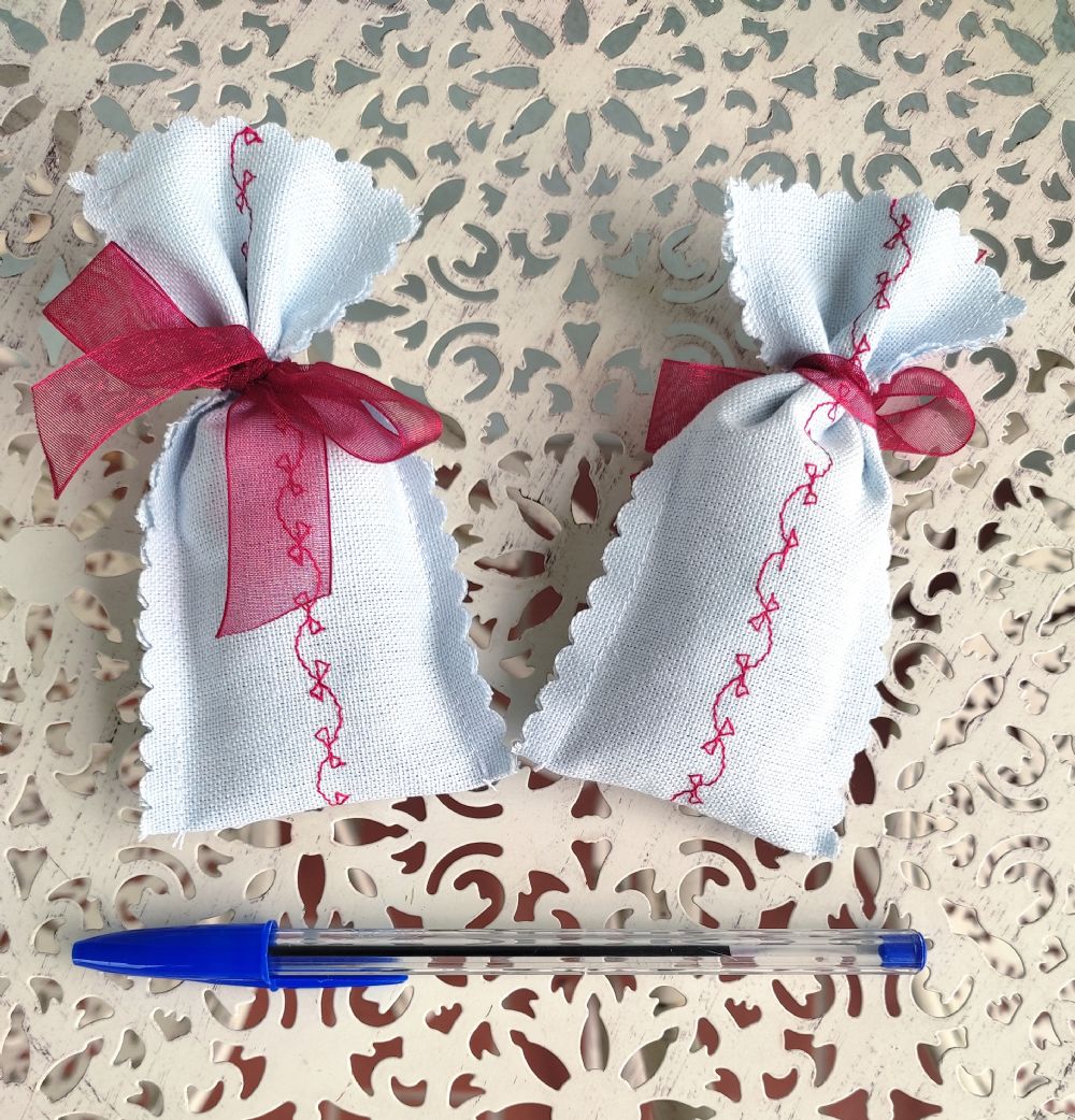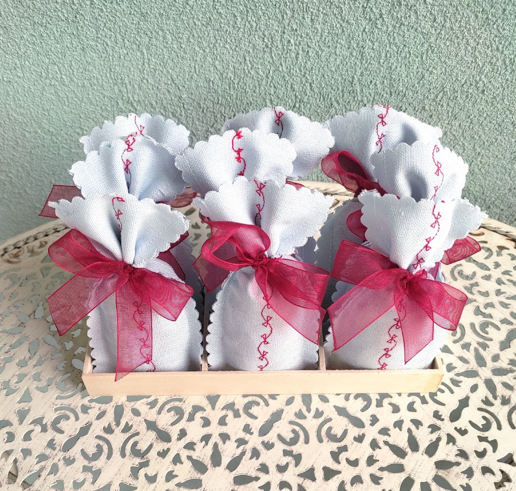 Realizzato con un bel tessuto nuovo colore azzurro chiaro, ricamato a macchina da me e confezionato in bustina trasparente regalabile.