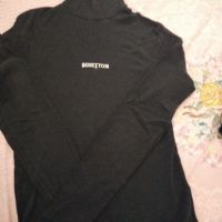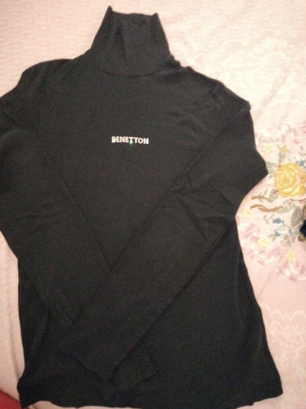 Maglia cotone colore nero, tg 10 anni, marca Benetton, collo alto, manica lunga, applicazioni strass davanti.