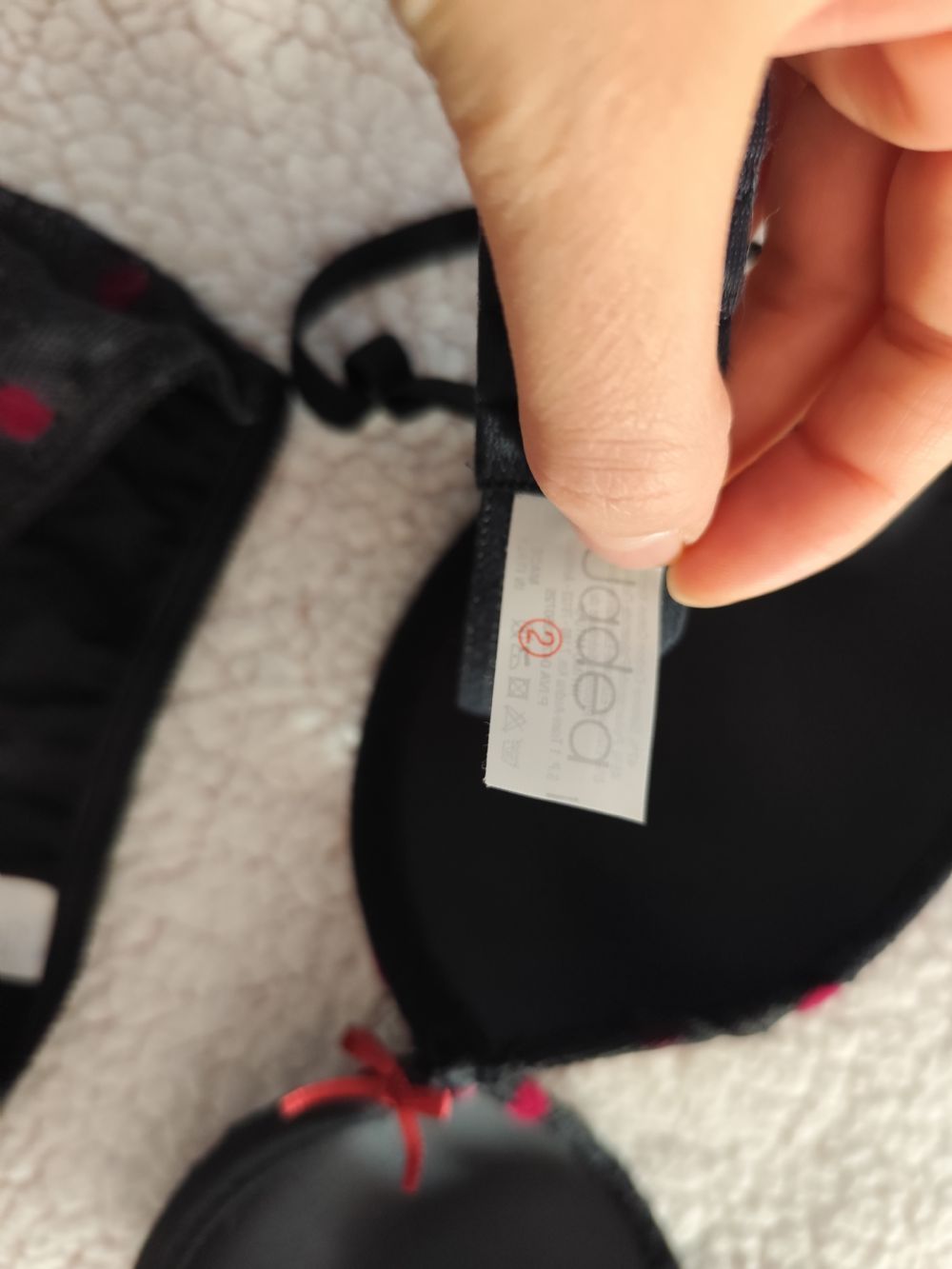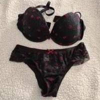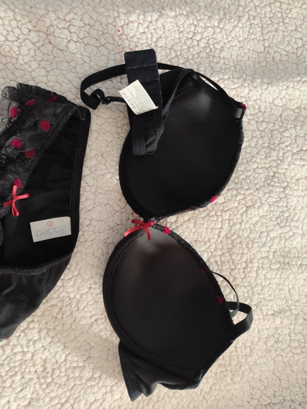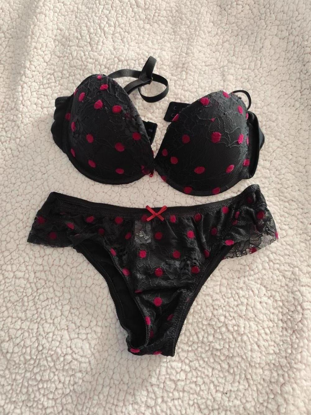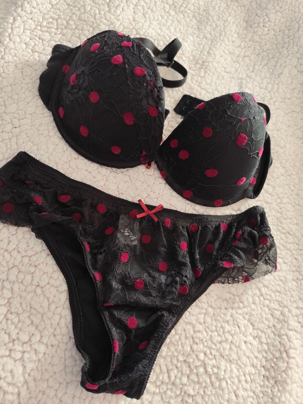 Coordinato intimo slip+reggiseno nuovo, mai usato ma non ho più la scatola. Slip normale, non sgambato e reggiseno con coppe imbottite, il tutto in pizzo e jersey. Entrambi taglia 2.