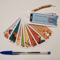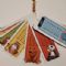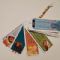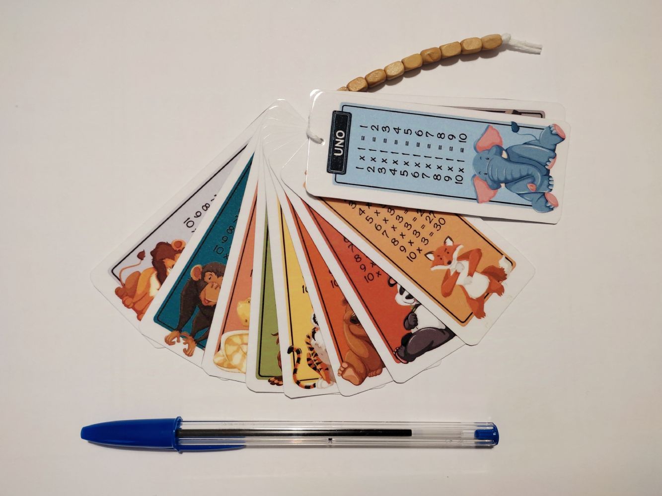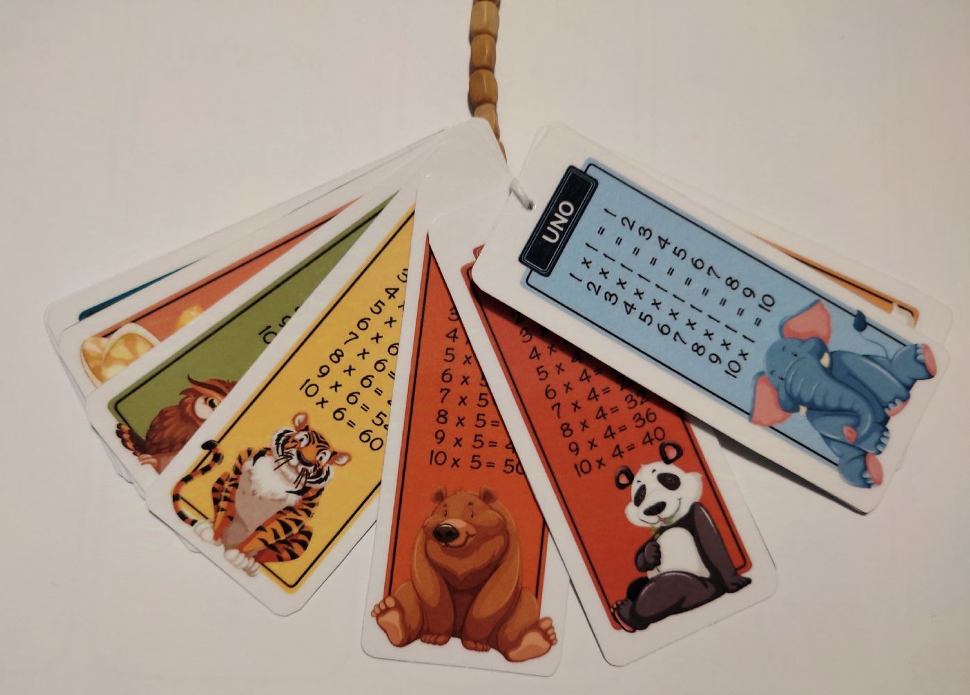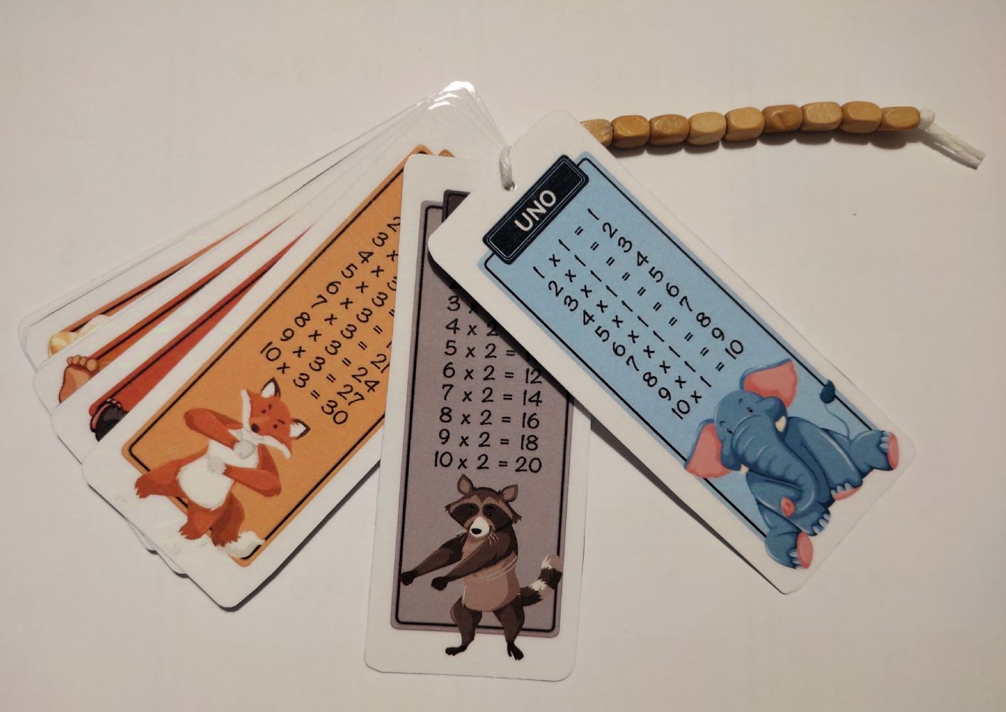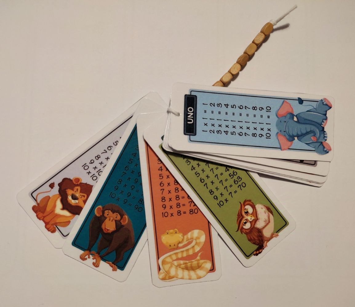 Tabelline colorate realizzate in cartoncino plastificato con cordoncino e perline di legno. Confezionate in bustina trasparente regalabile.