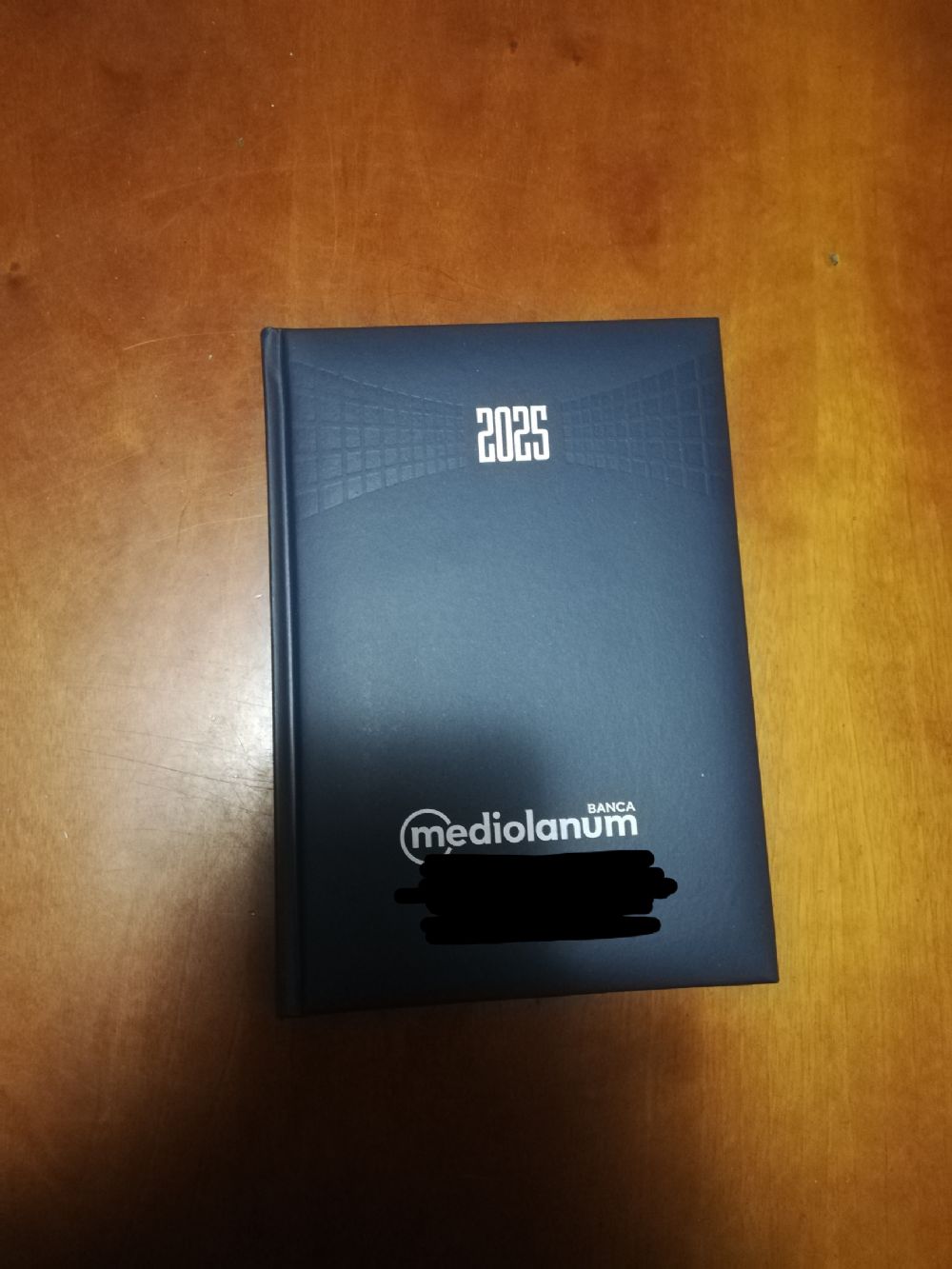 Agenda 2025 brandizzata misure 15x21 cm. Colore blu scuro, copertina rigida. Ho coperto le info sulla copertina per privacy. No difetti.