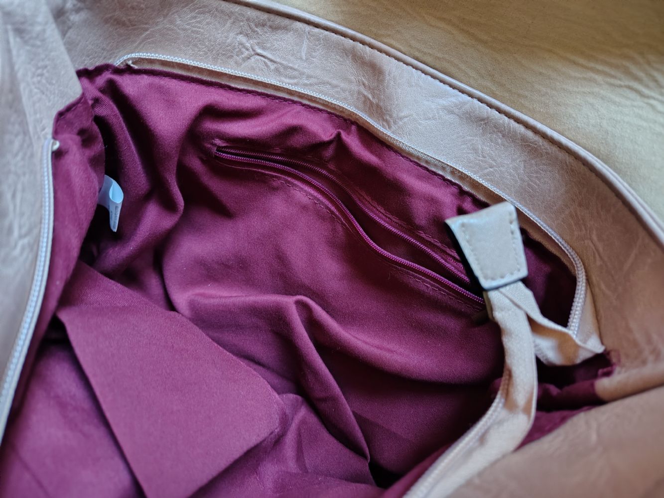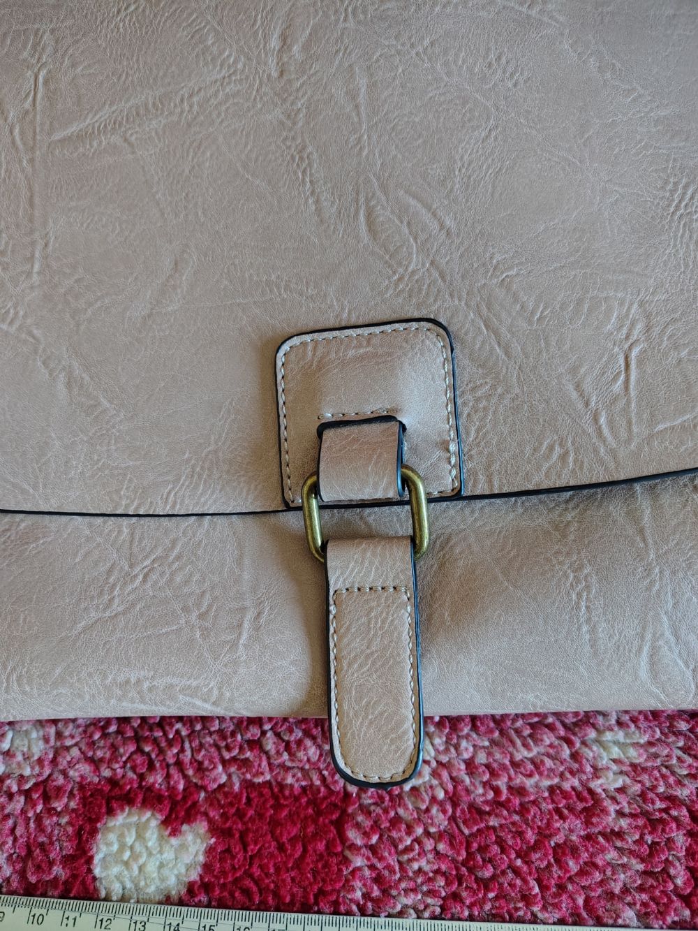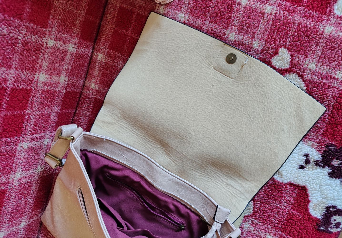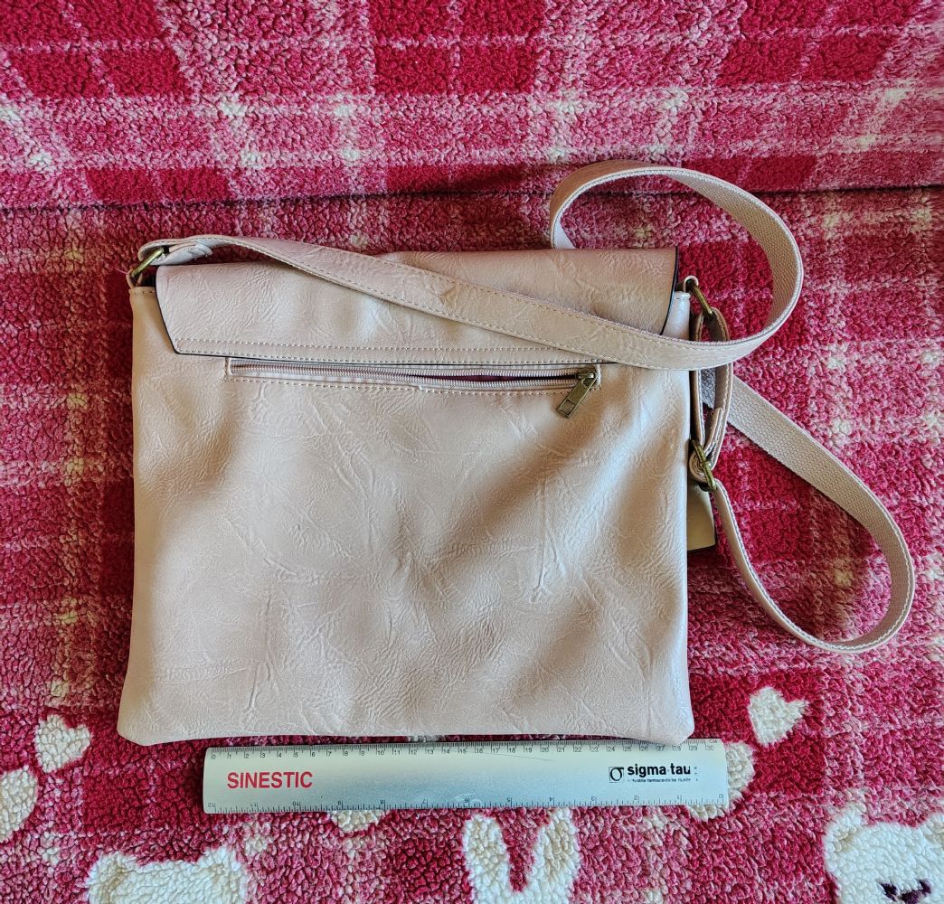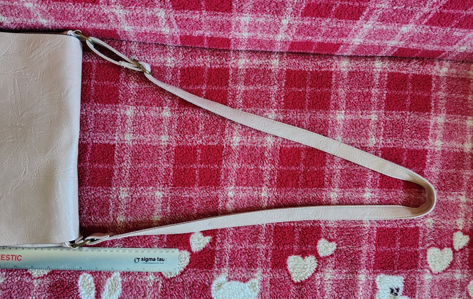 Descrizione:Borsa a tracolla regolabile tono di beige con rivestimento interno bordeaux e rifiniture nere. Materiale borsa sintetico, fodera cotone penso. Può contenere un documento A4.