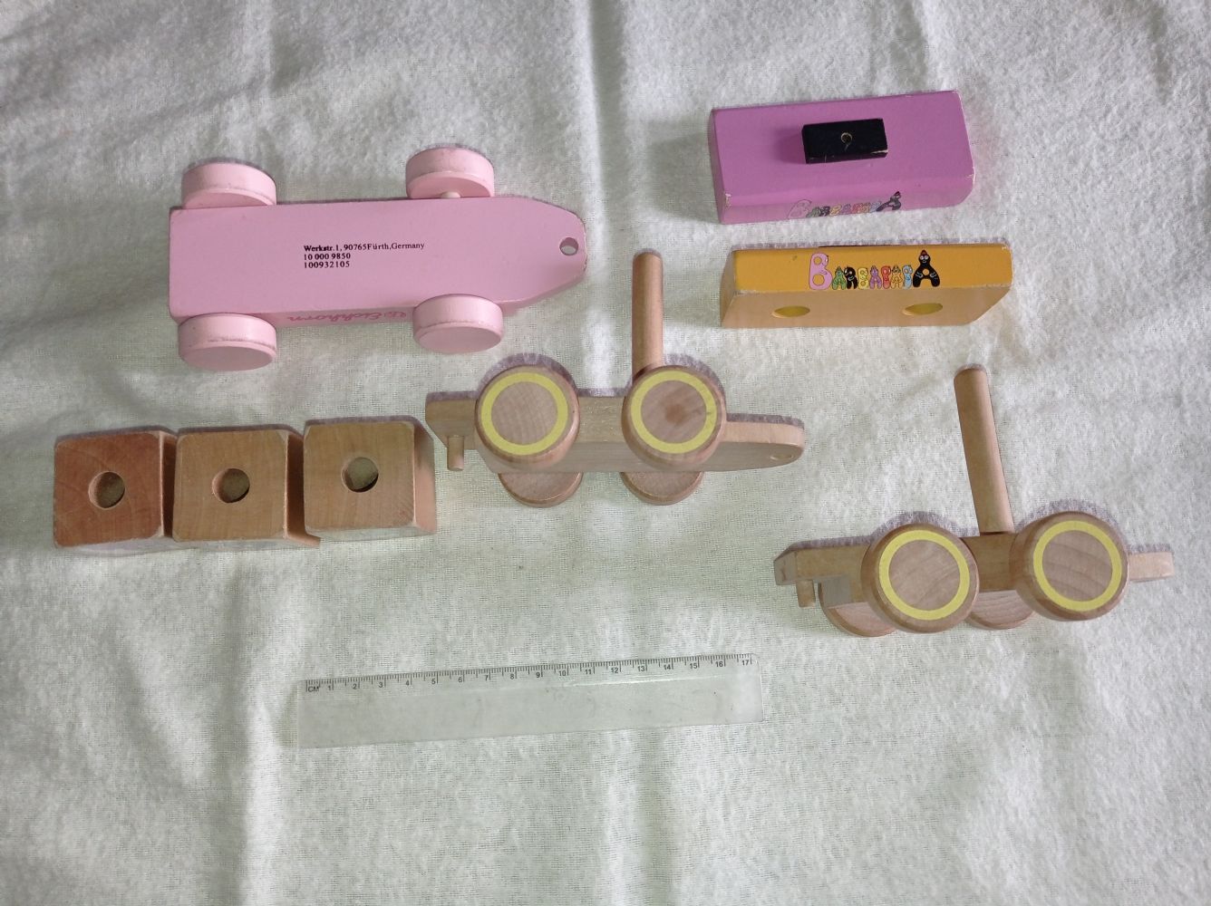 Descrizione:Più che treno direi vagoni del trenino di legno con 2 bacchette, dove inserire i cubetti con i personaggi, e tettoie per chiuderli. Ruote mobili