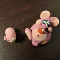 Descrizione:A sinistra maialino in gomma grande come una moneta da 1 euro. A destra fischietto a forma di topo, in terracotta, mai usato e solo esposto. 2 crediti l'uno