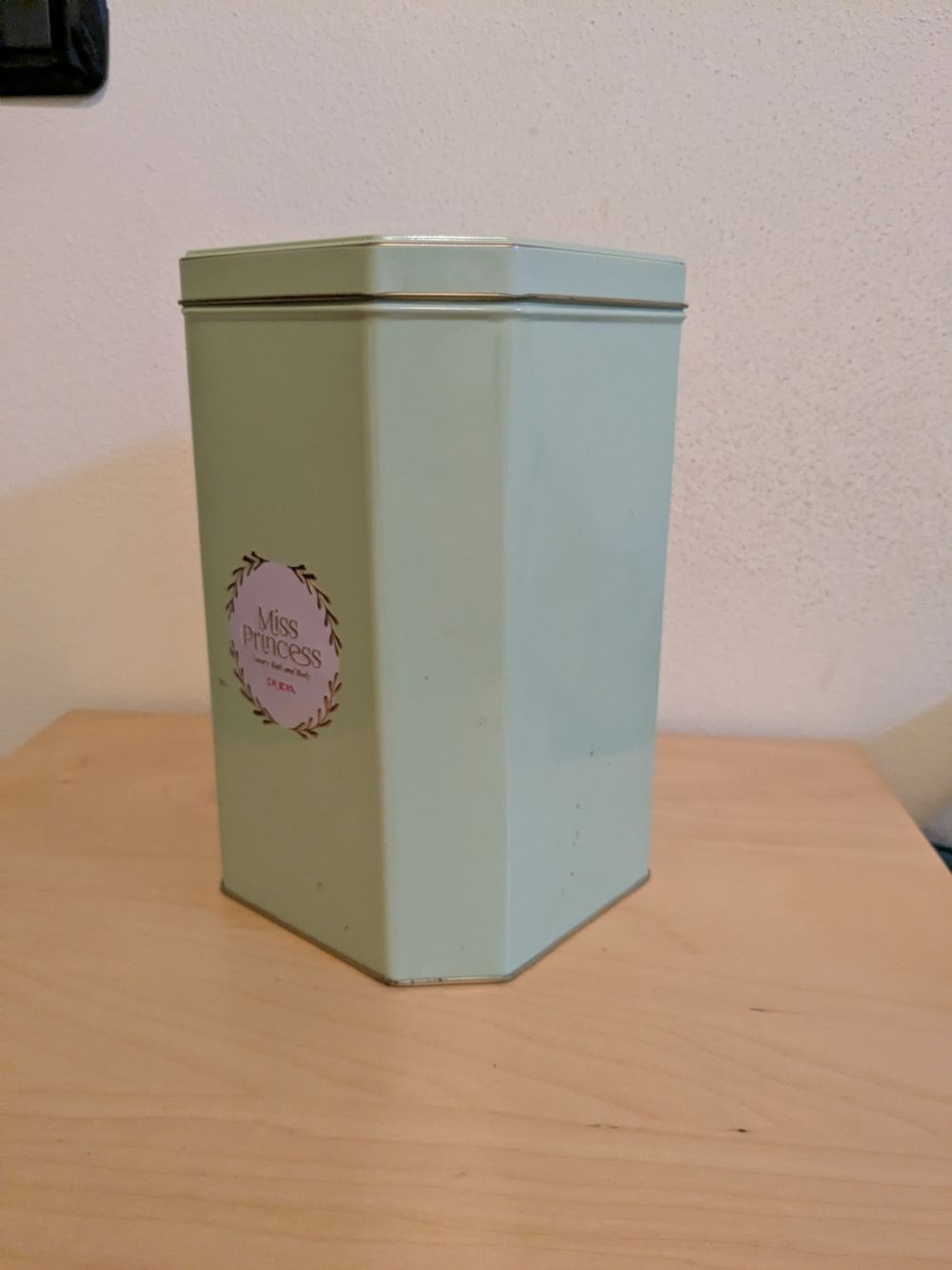 Scatola in latta verde menta chiaro, forma ottagonale. In buone condizioni. Altezza cm 21