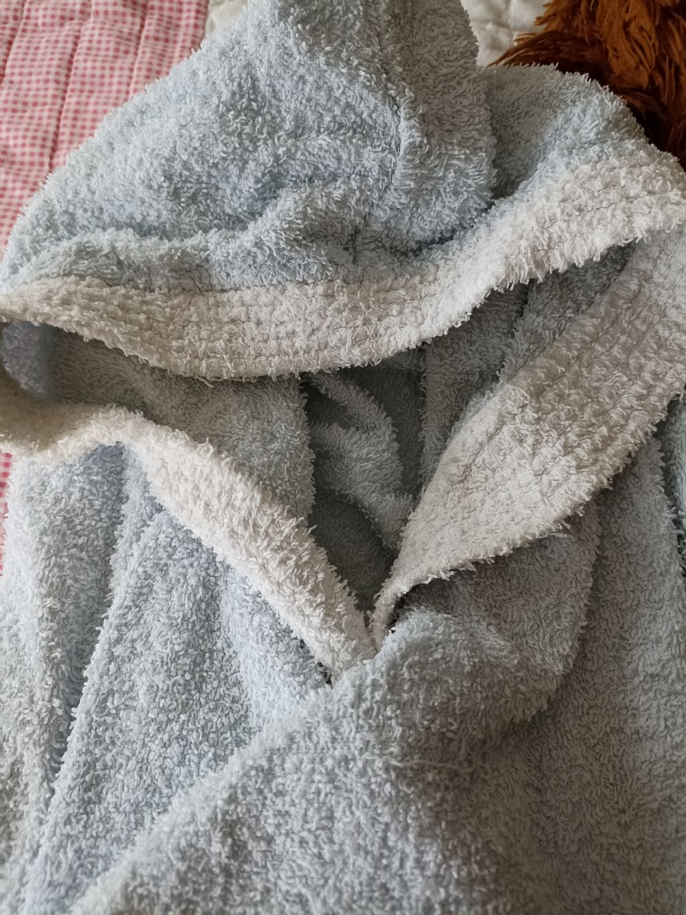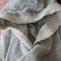 Descrizione:Accappatoio tg L azzurro chiaro con bordi bianchi, ha cappuccio e cintura, tasche. Non è rotto. È pulito. 100% cotone, non si legge più la marca perché l'etichetta si è scolorita.