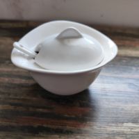Descrizione:Zuccheriera bianca con forma ovale, compresa di coperchio e cucchiaino, in perfette condizioni, senza sbavature come da foto.