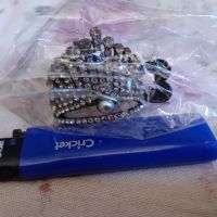Nera, circolare, su ciascun lato a forma di corona con strass e una perla, ovviamente finta. Comprata online e rimasta confezionata, sigillata.