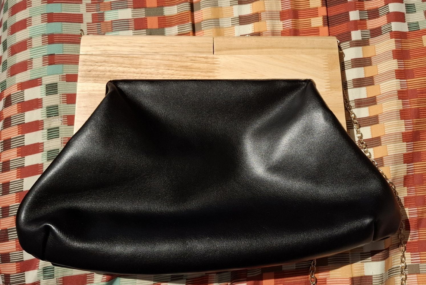 Metto usato poco ma in realtà mai usata, ecopelle e legno, si chiude coi magneti, con tracolla metallica dorata. Base circa 30 cm.