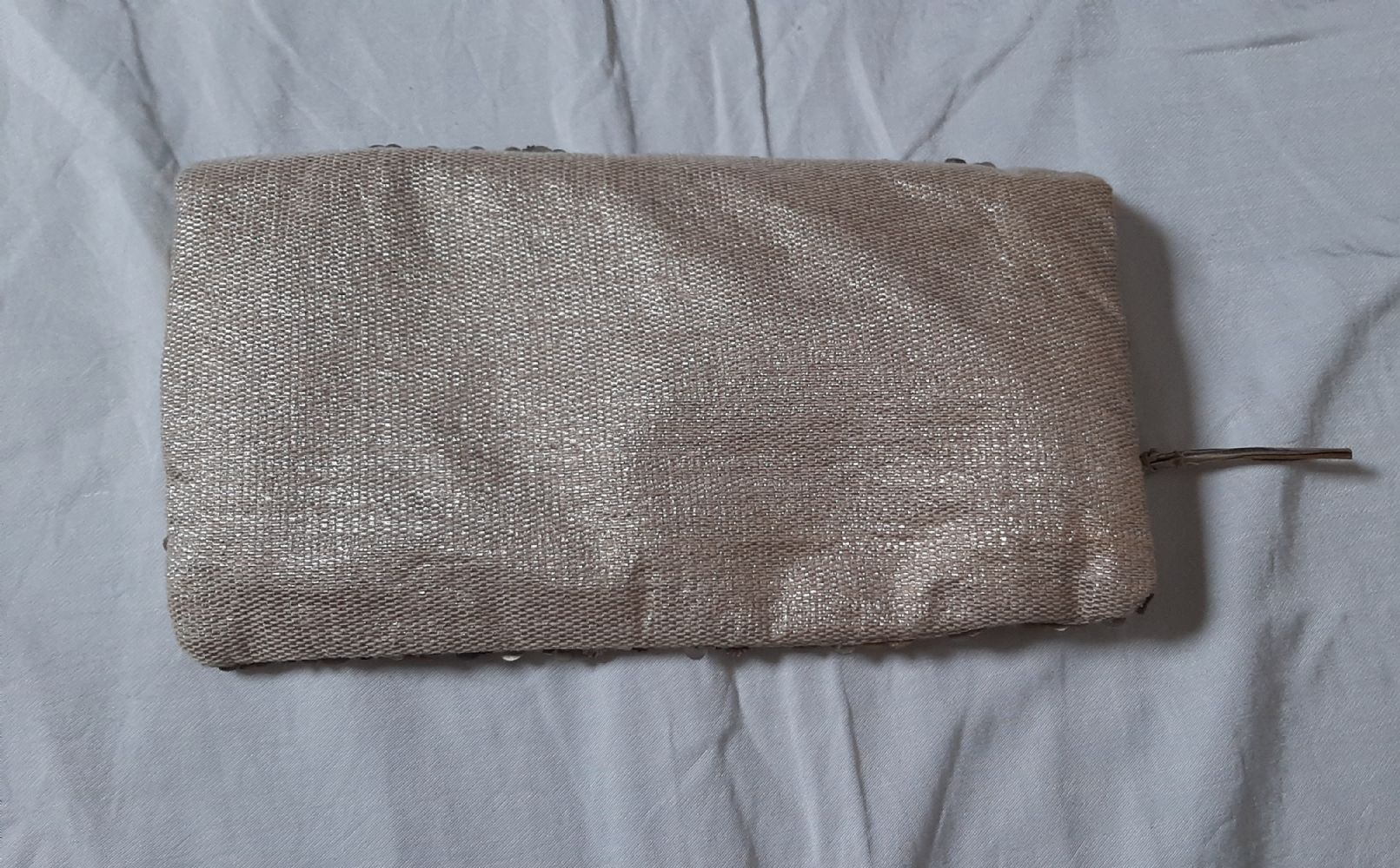 Descrizione:Pochette in tessuto di paillette color oro antico, in ottimo stato, senza particolari difetti, solo il laccetto della zip in finta pelle è leggermente rovinato.
