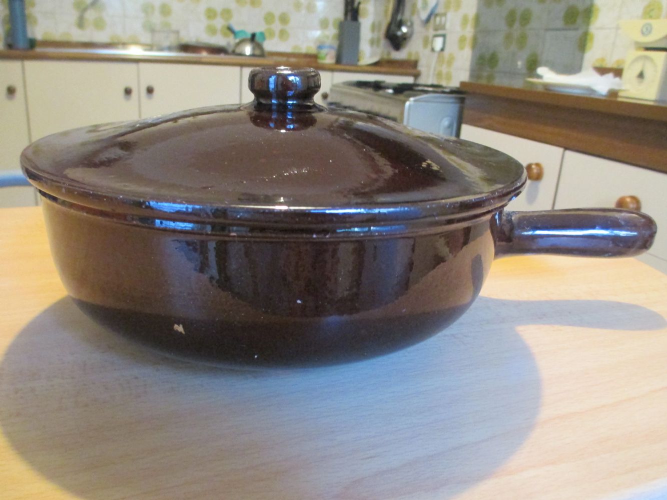 Descrizione:Pentola in terracotta con manico e coperchio; con qualche segno d'usura, ma tenuta benissimo.