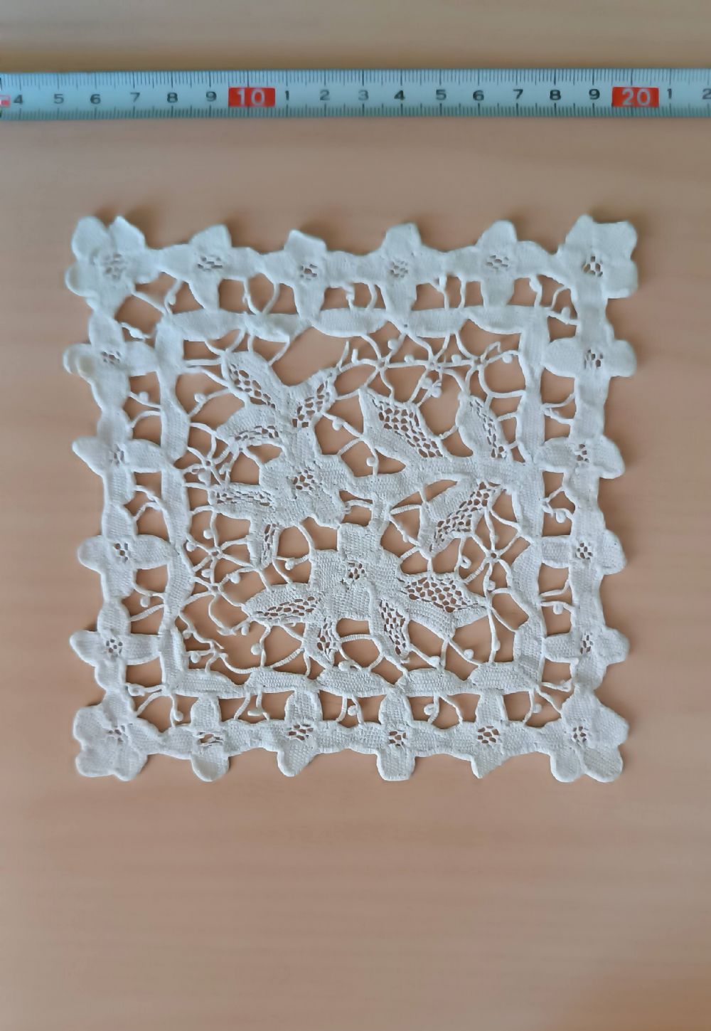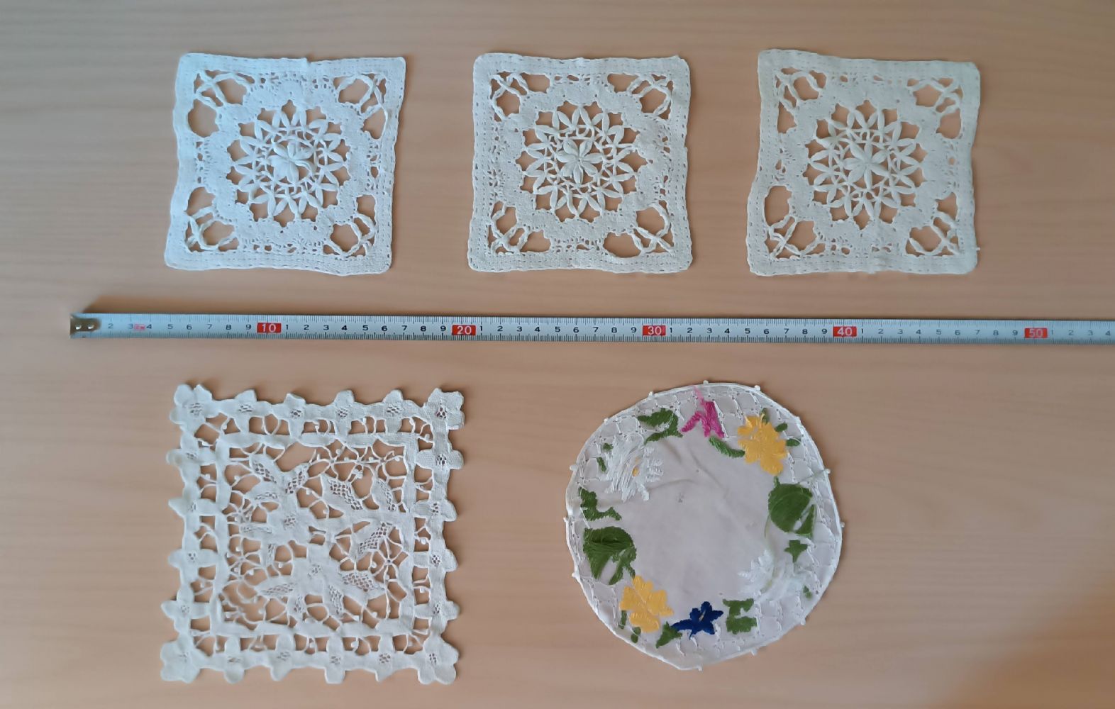 3+1 centrini all’uncinetto in filo di cotone, quadrati + regalo quello tondo colorato ricamato a mano con difetti… Misure in foto.