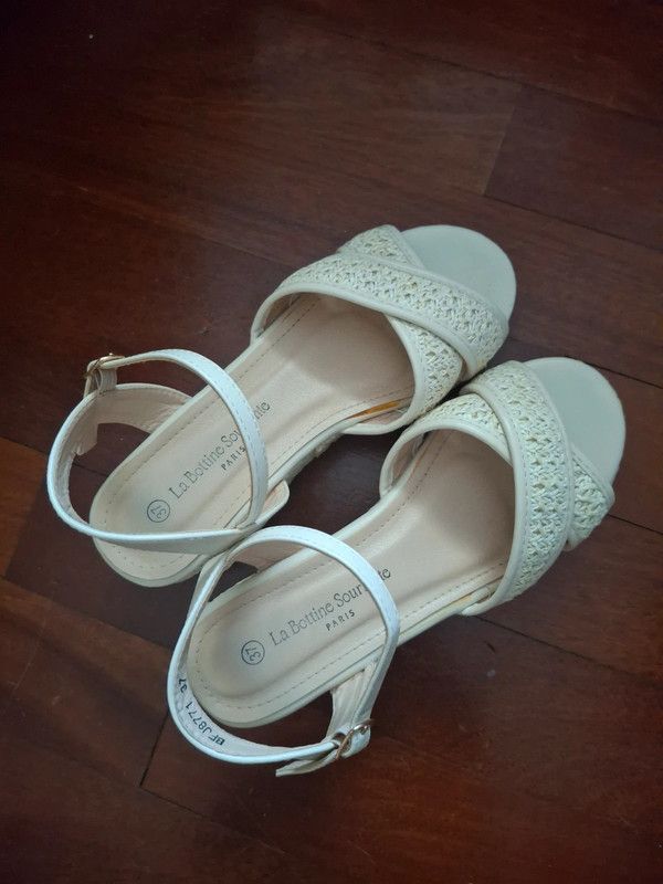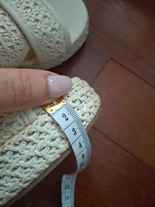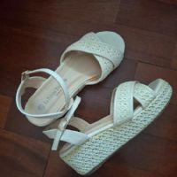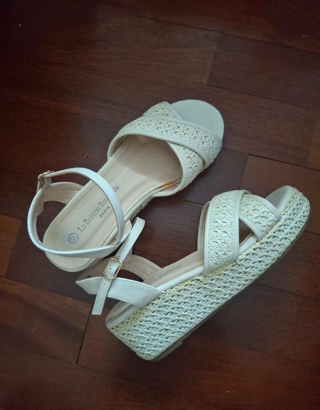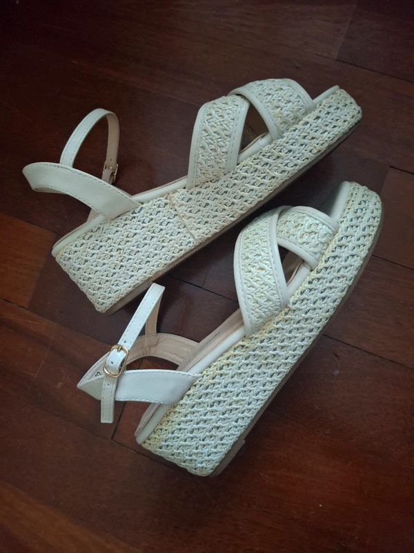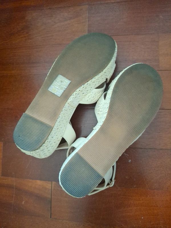 Descrizione:Scarpe sandali numero 37 con zeppa beige tipo espadrillas ma fatte di plastica, con cinturino alla caviglia, altezza della zeppa 6 cm dietro e circa 3 cm davanti. Usate pochissimo come si vede dalla suola, unico difetto è la colla che ha iniziato un po' a ingiallirsi sui bordi.