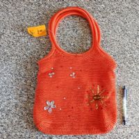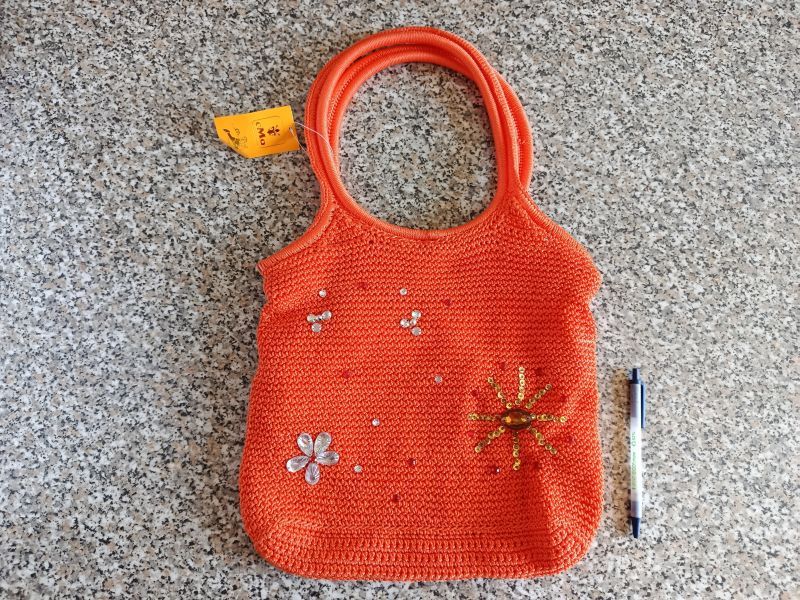 Piccola borsetta da donna, color arancione scuro, ricamata. Penna per proporzioni