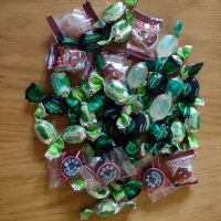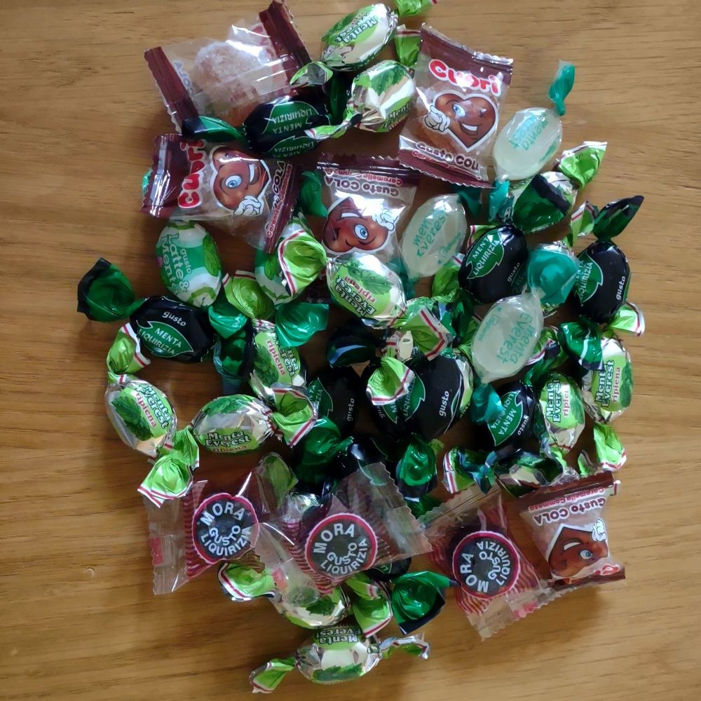 Descrizione:125 grammi circa di caramelle dure alla menta, menta-liquirizia, alcune gommose gusto Cola o liquirizia. Ne ho comprate due buste miste ma questi gusti non sono apprezzati in famiglia.