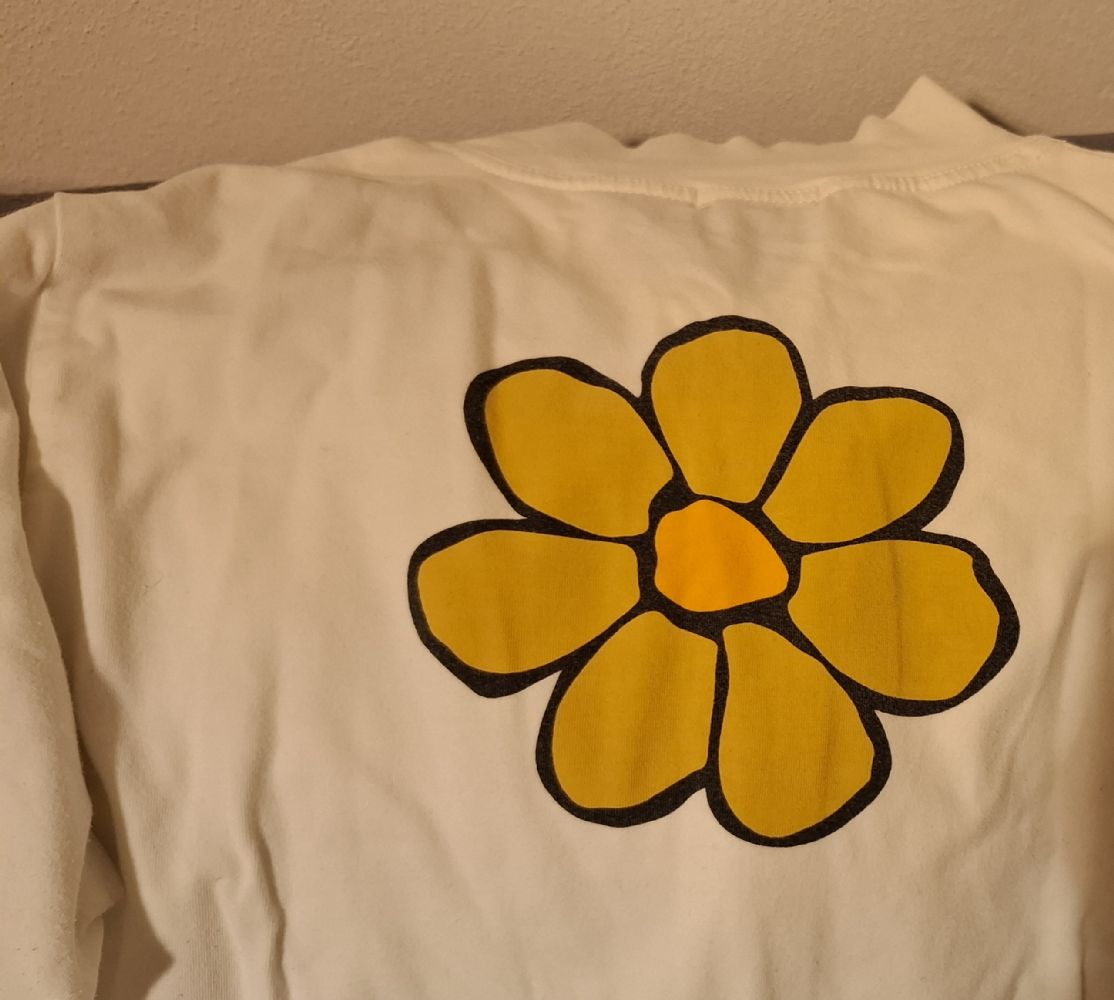 Quella bianca ha la stampa grande dietro, marcata L/XL ma veste S/M.