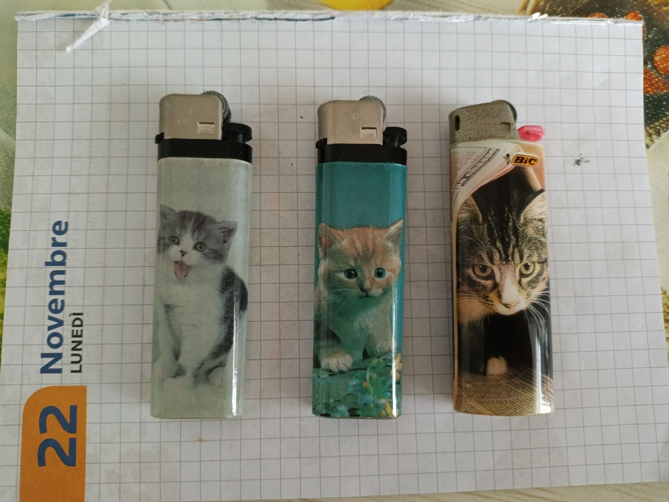 3 accendini con gatti, mi pare che non funzionino ma le mie dita fanno fatica a fare il movimento per farli scattare, regalo se volete provare o per collezione