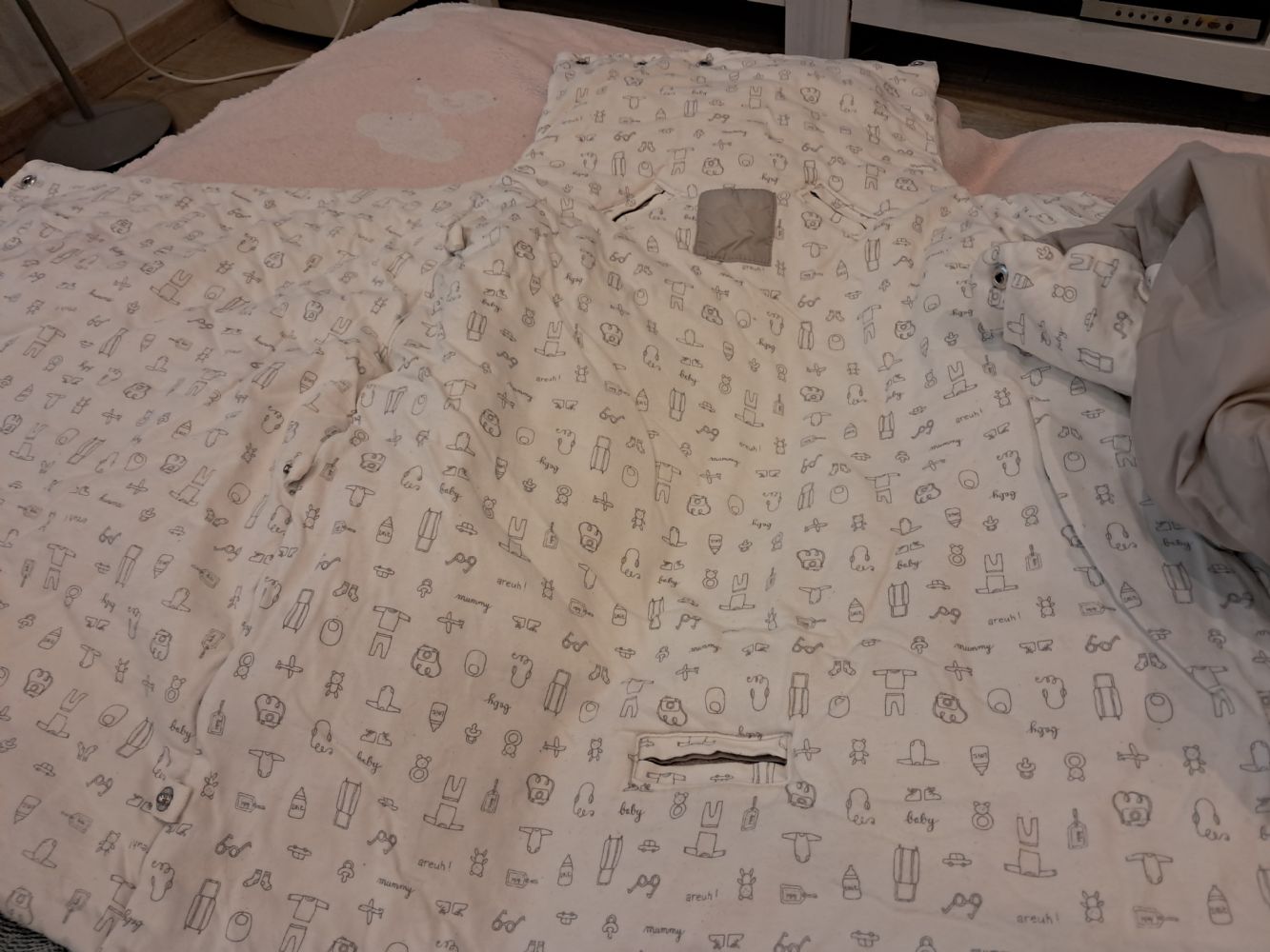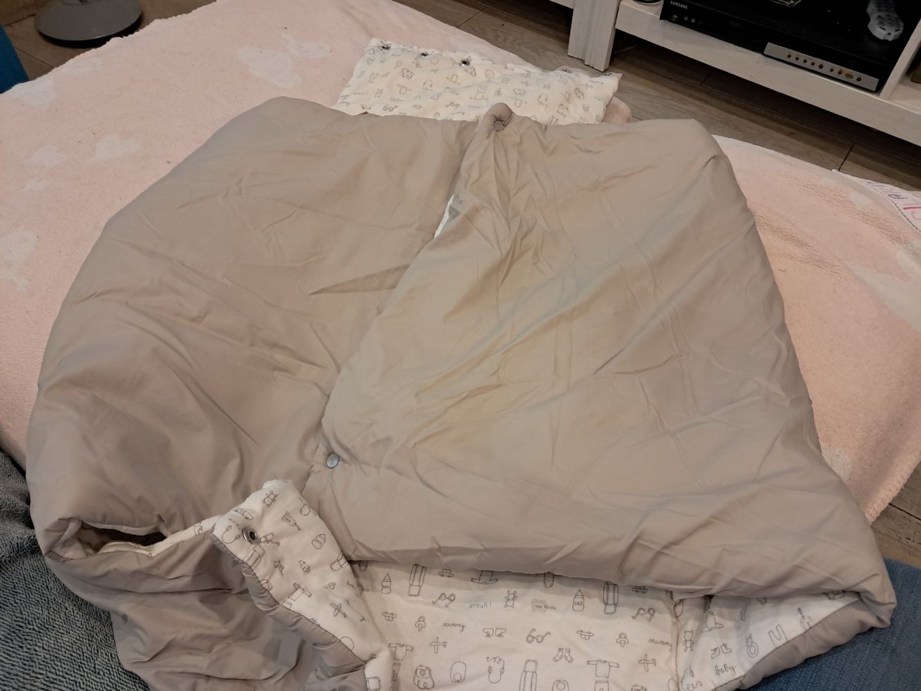Descrizione:Nin vedo la marca. Imbottito. Ha i passanti per fissarli al passeggino ha una macchia rosa sul fondo di cui allego foto