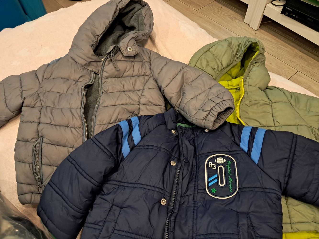 1 bomber imbottito, 1 100 g verdone e un piumino grigio