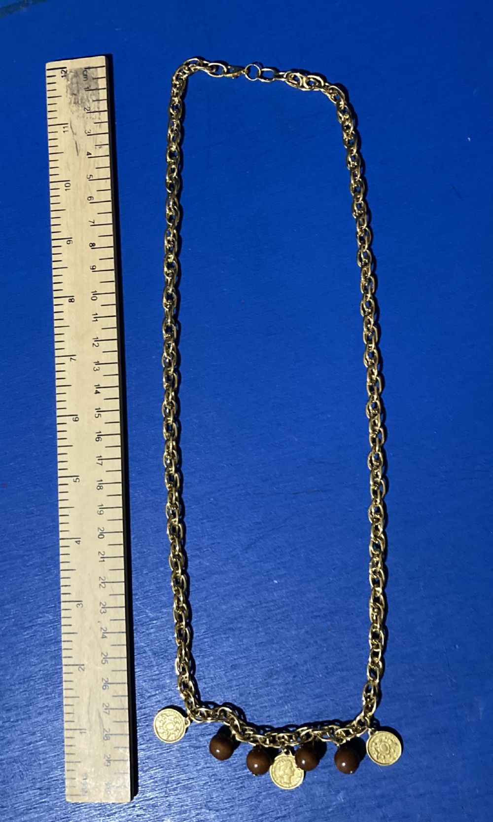 Collana con un design unico, arricchita da tre piccole monetine. - Lunghezza della collana: circa 28 cm. - Chiusura a moschettone.