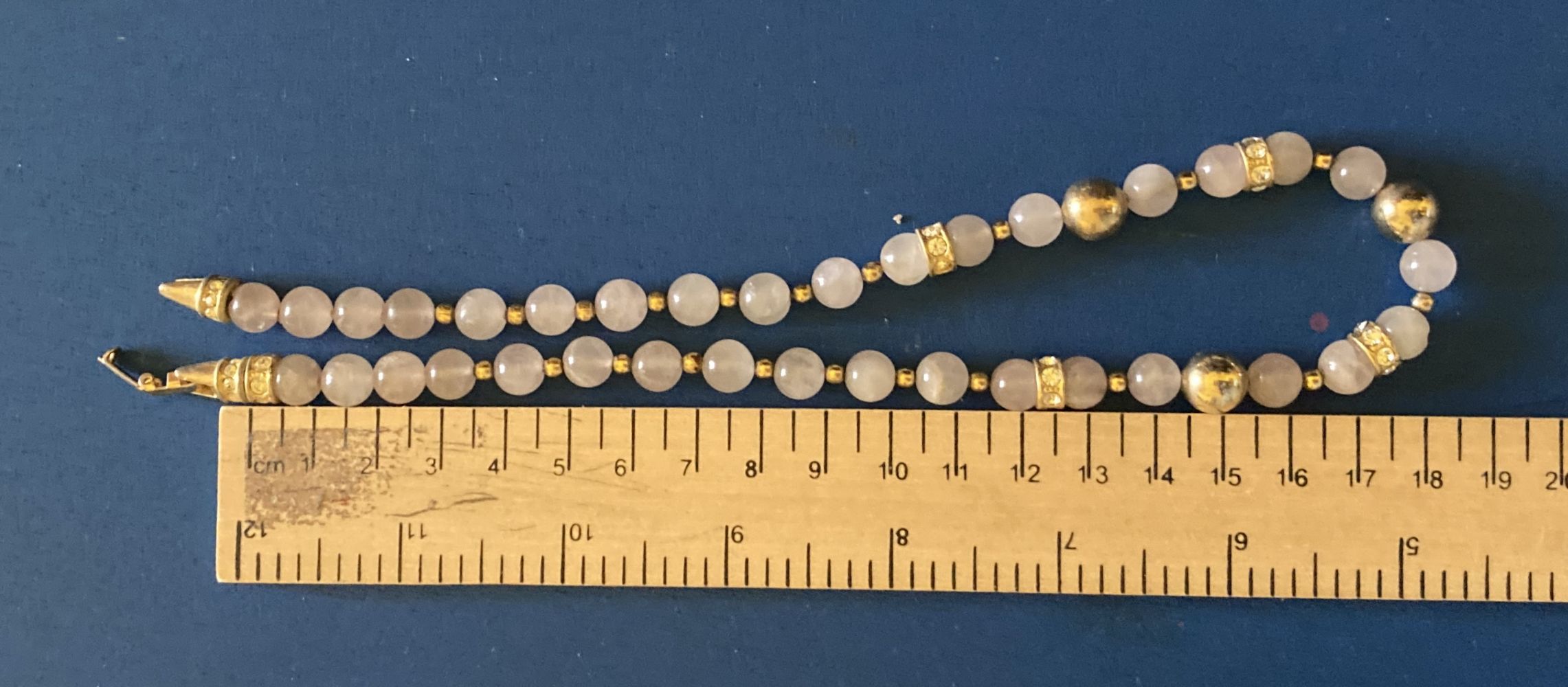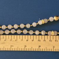 Elegante collana con perle beige e dettagli dorati. Elementi decorativi dorati tra le perle. Chiusura a moschettone dorata.