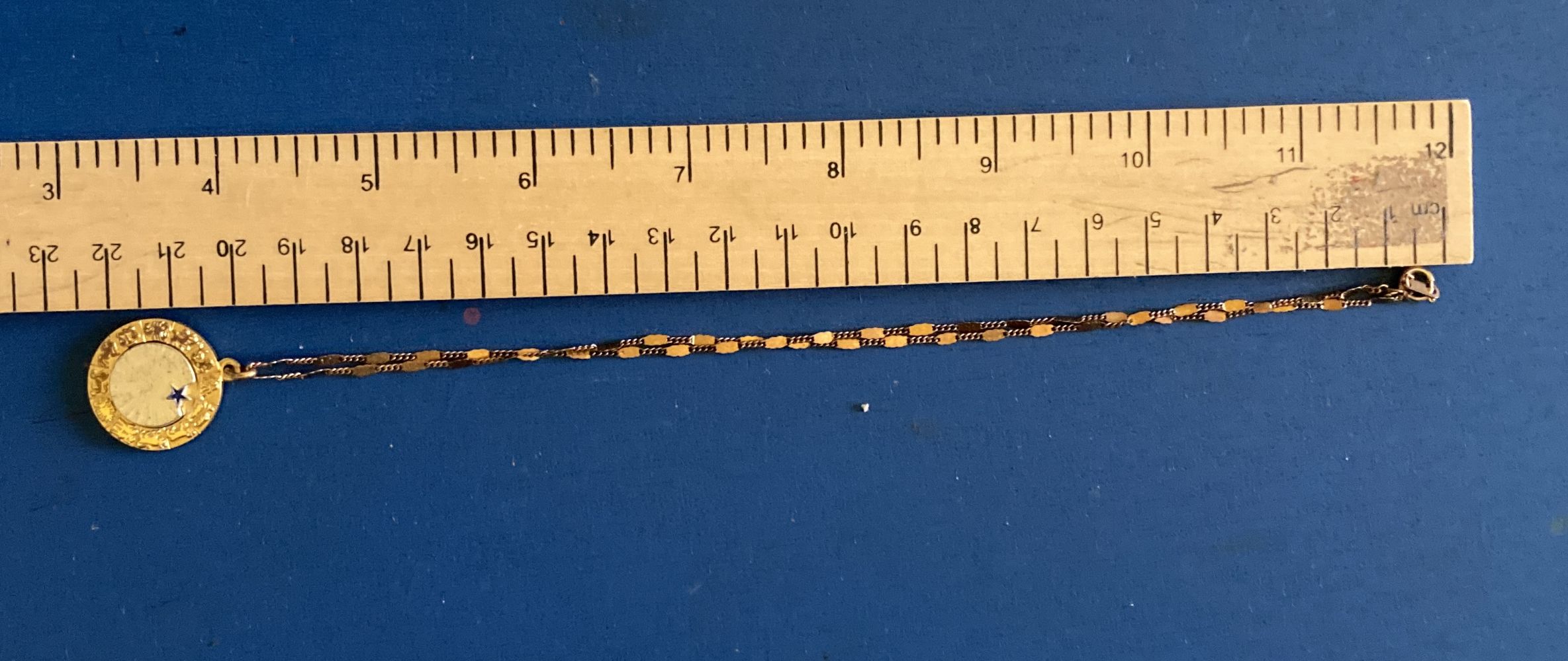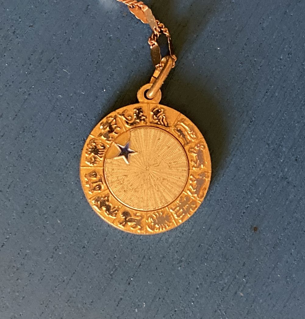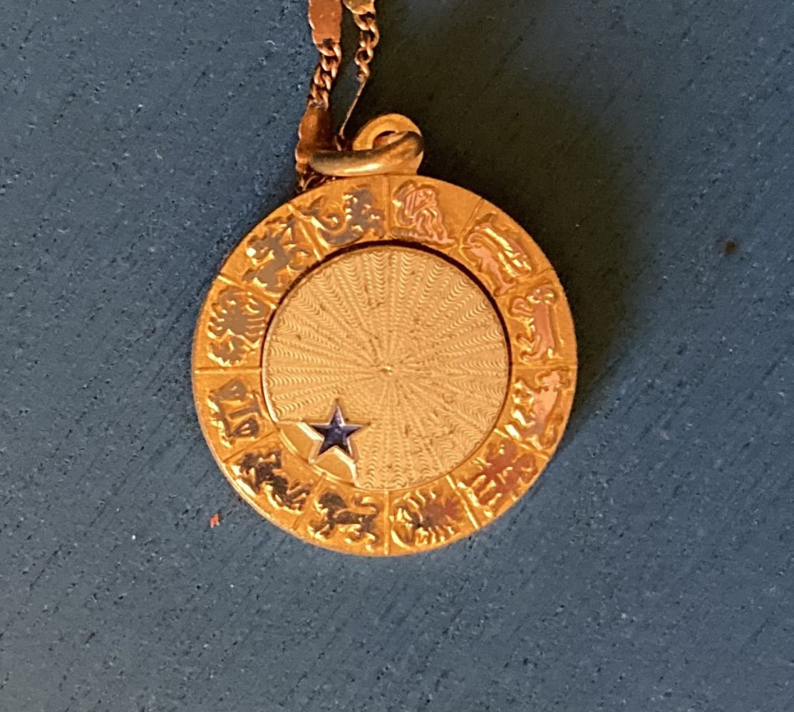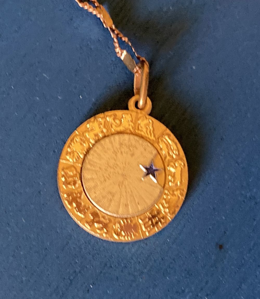 Descrizione:Collana con un ciondolo a tema zodiacale. Il design del ciondolo è circolare e girevole, con dettagli incisi e una piccola stella blu ad indicare il segno zodiacale prescelto.