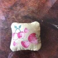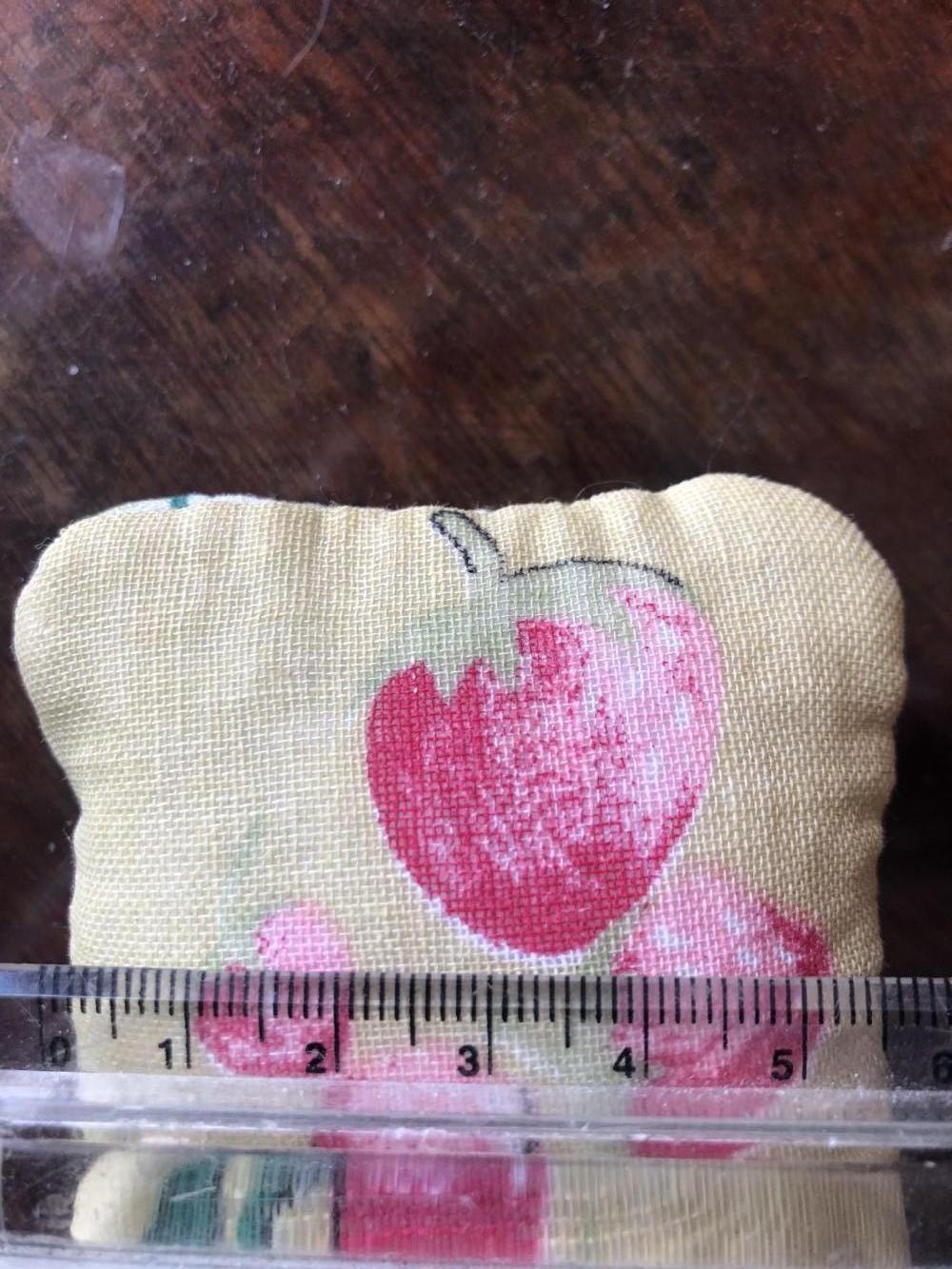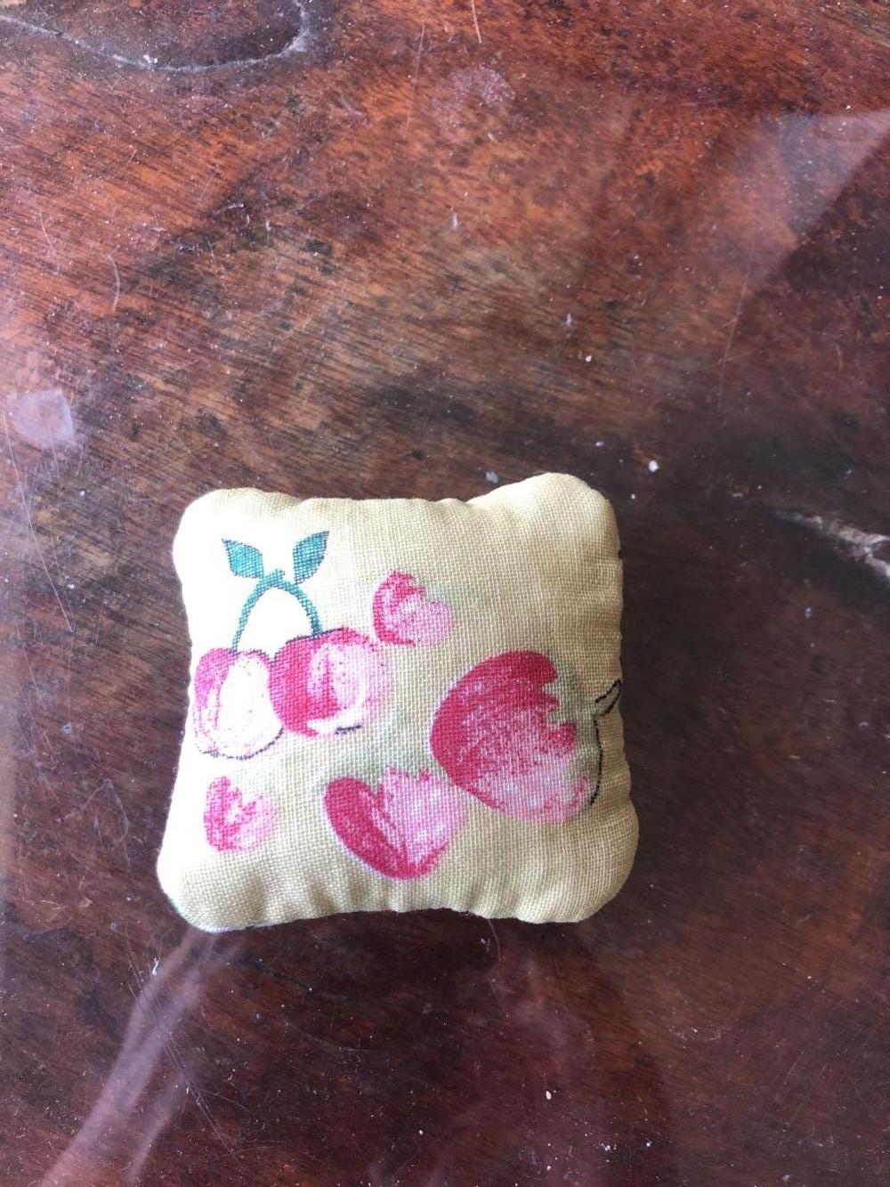 Descrizione:delizioso cuscinetto puntaspilli ma anche per aghi da cucito - lo trovo delizioso - è vintage ma in buono stato - da un lato frutta dall'altro righe gusto d'antan - a voi!