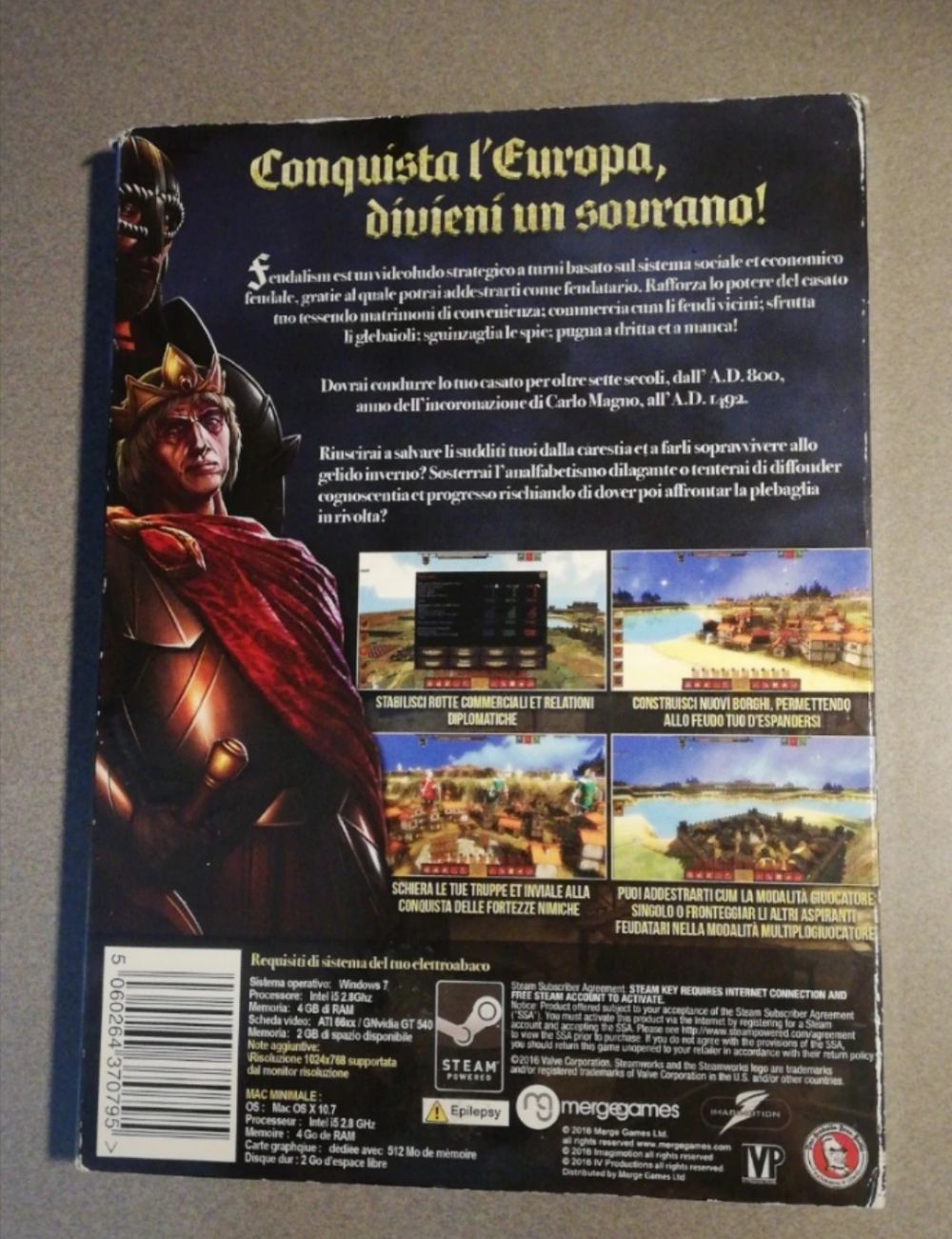 Descrizione:Videogioco per pc, Feudalism conquista l'Europa, divieni un sovrano. Specifiche in foto.