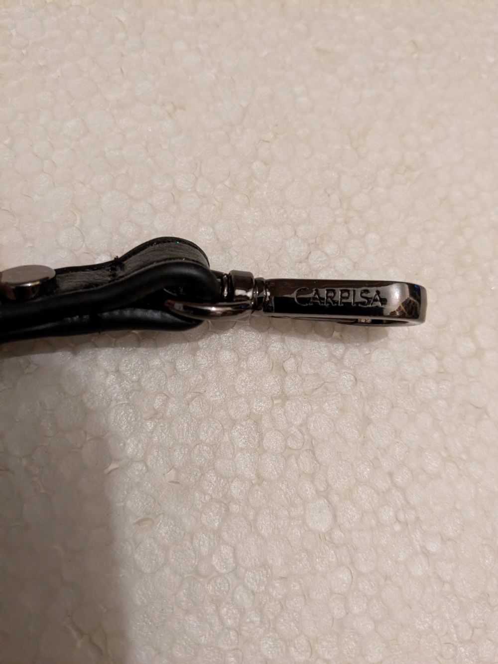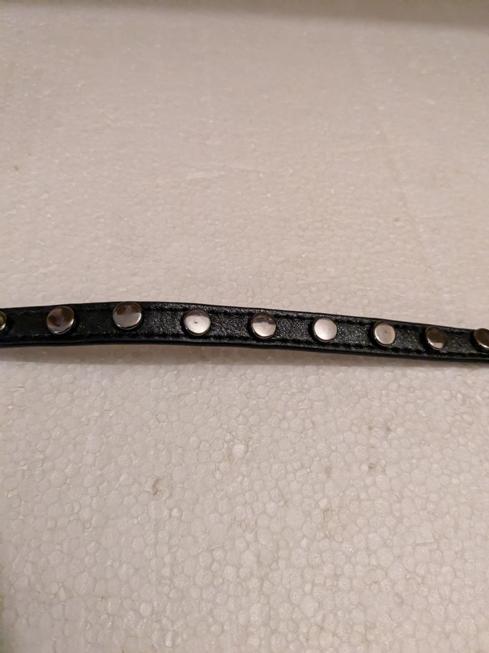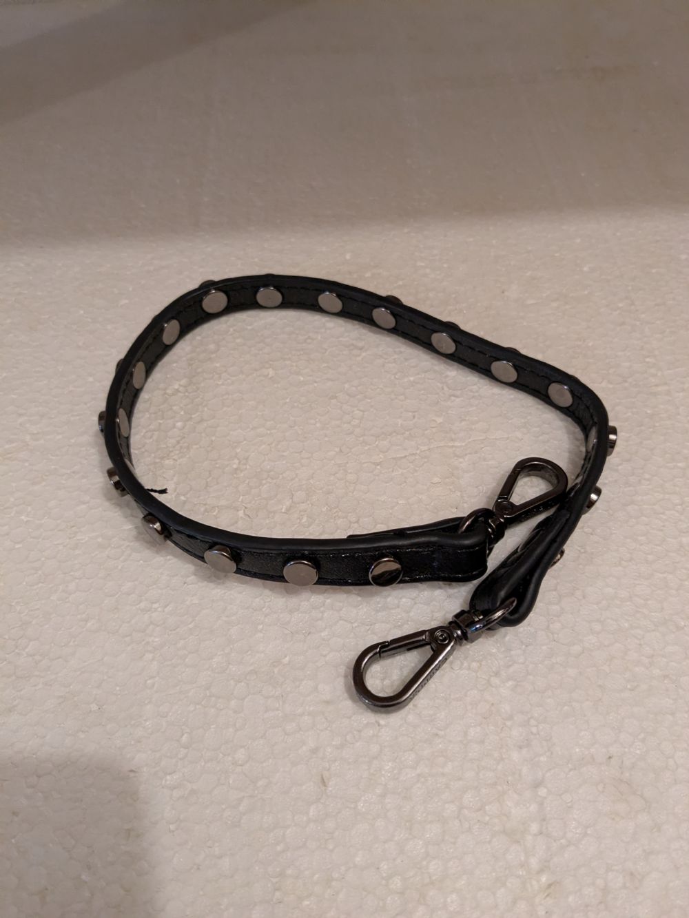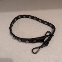 Descrizione:Maniglia in ecopelle con borchie, due clip alle estremità, era di una borsa Carpisa. Lunghezza totale cm 43.