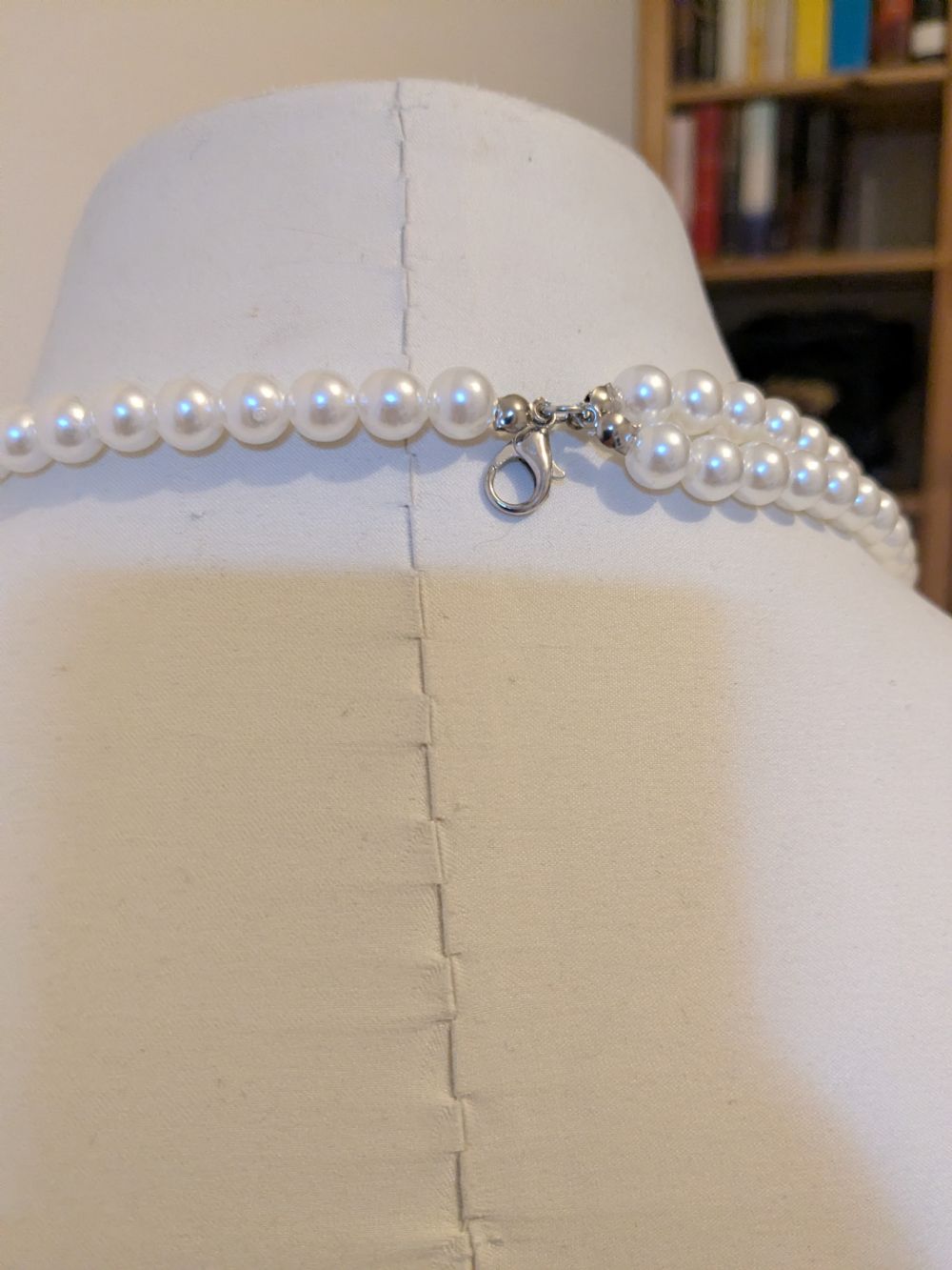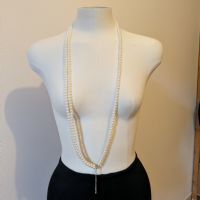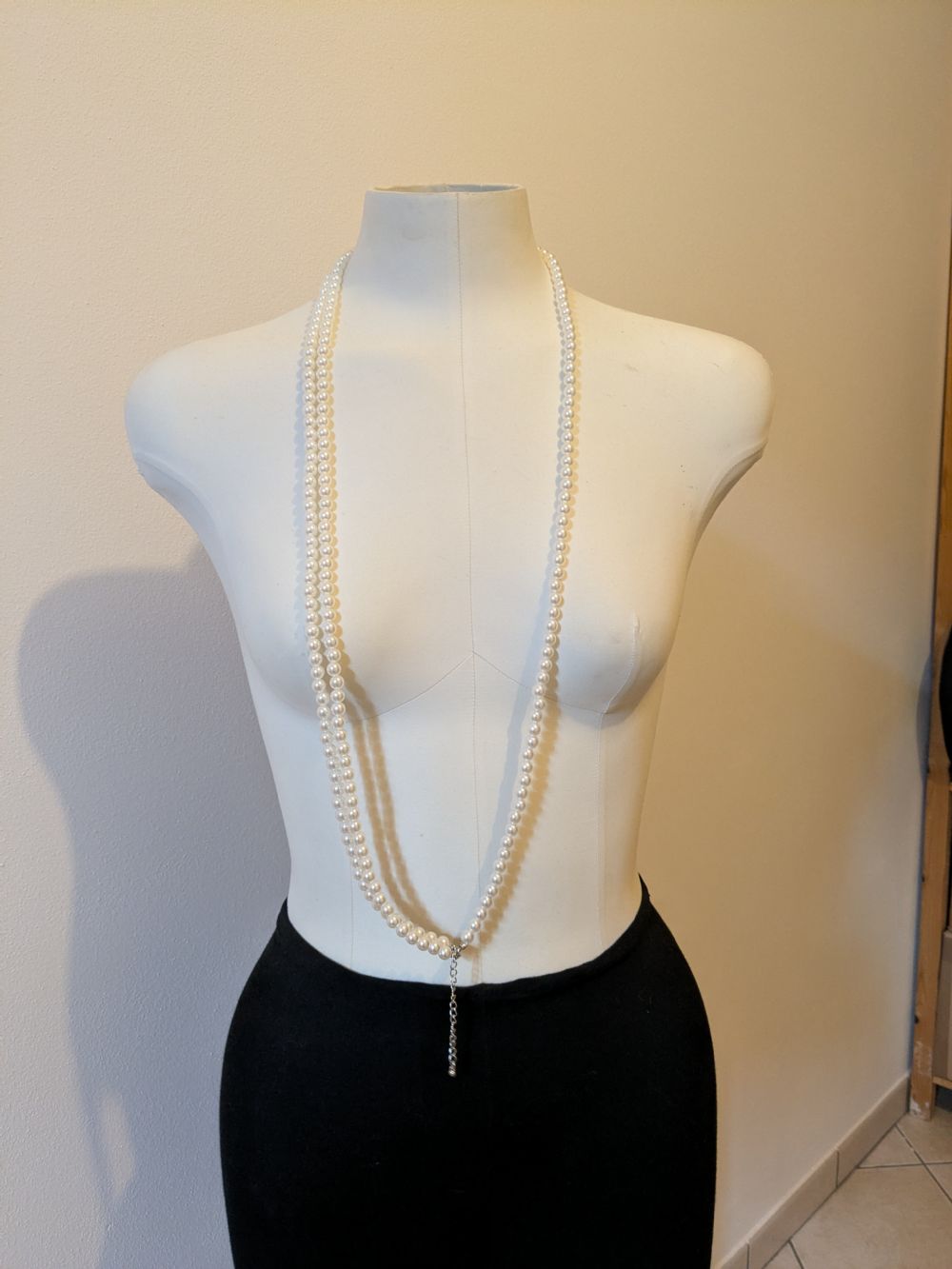 Filo di perle molto lungo e doppio da un lato. Ha una doppia clip per cambiare l''allacciatura