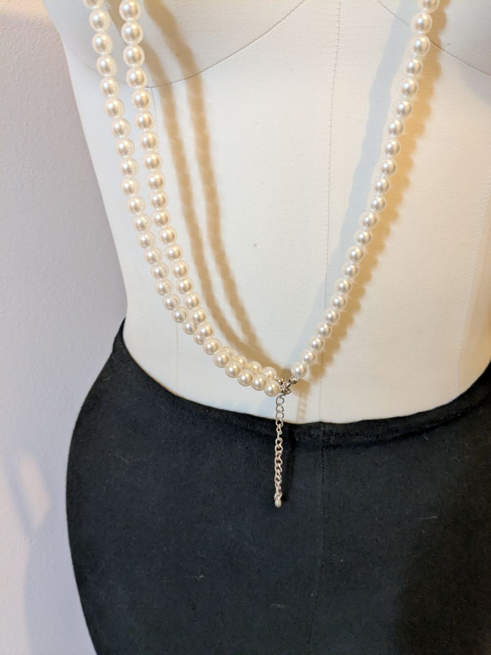 Filo di perle molto lungo e doppio da un lato. Ha una doppia clip per cambiare l'allacciatura