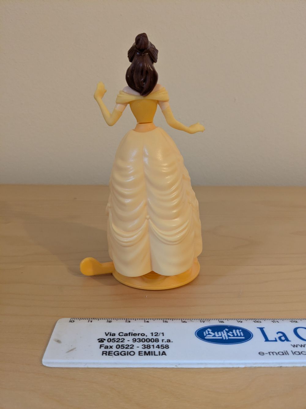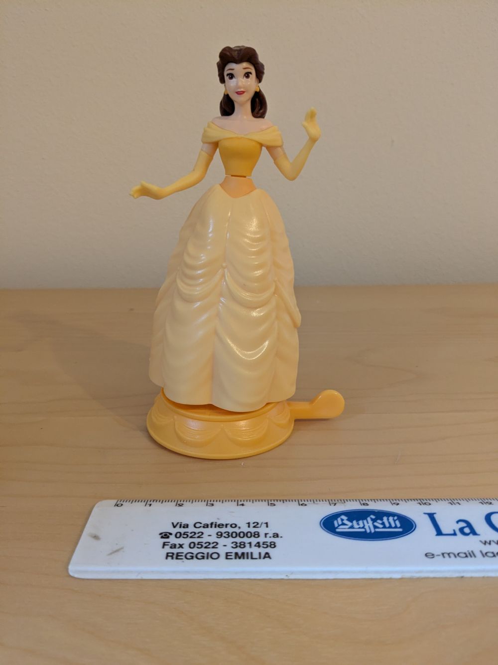 Descrizione:Giochino Belle della Bella e la Bestia. Muovendo la bambolina c'è una rotella sotto che la fa girare su se stessa. In plastica, altezza cm 16