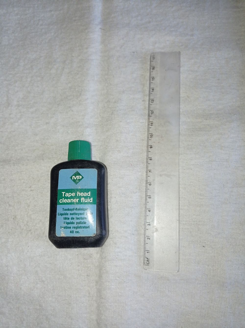 Liquido per pulizia testine per registratori, flaconcino vintage e con all'interno circa metà contenuto.